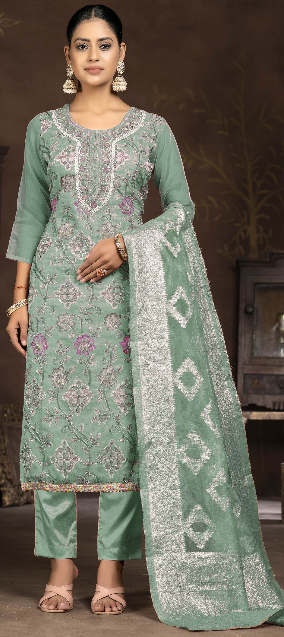 Organza Silk Party Wear Salwar Kameez in Green with Thread work