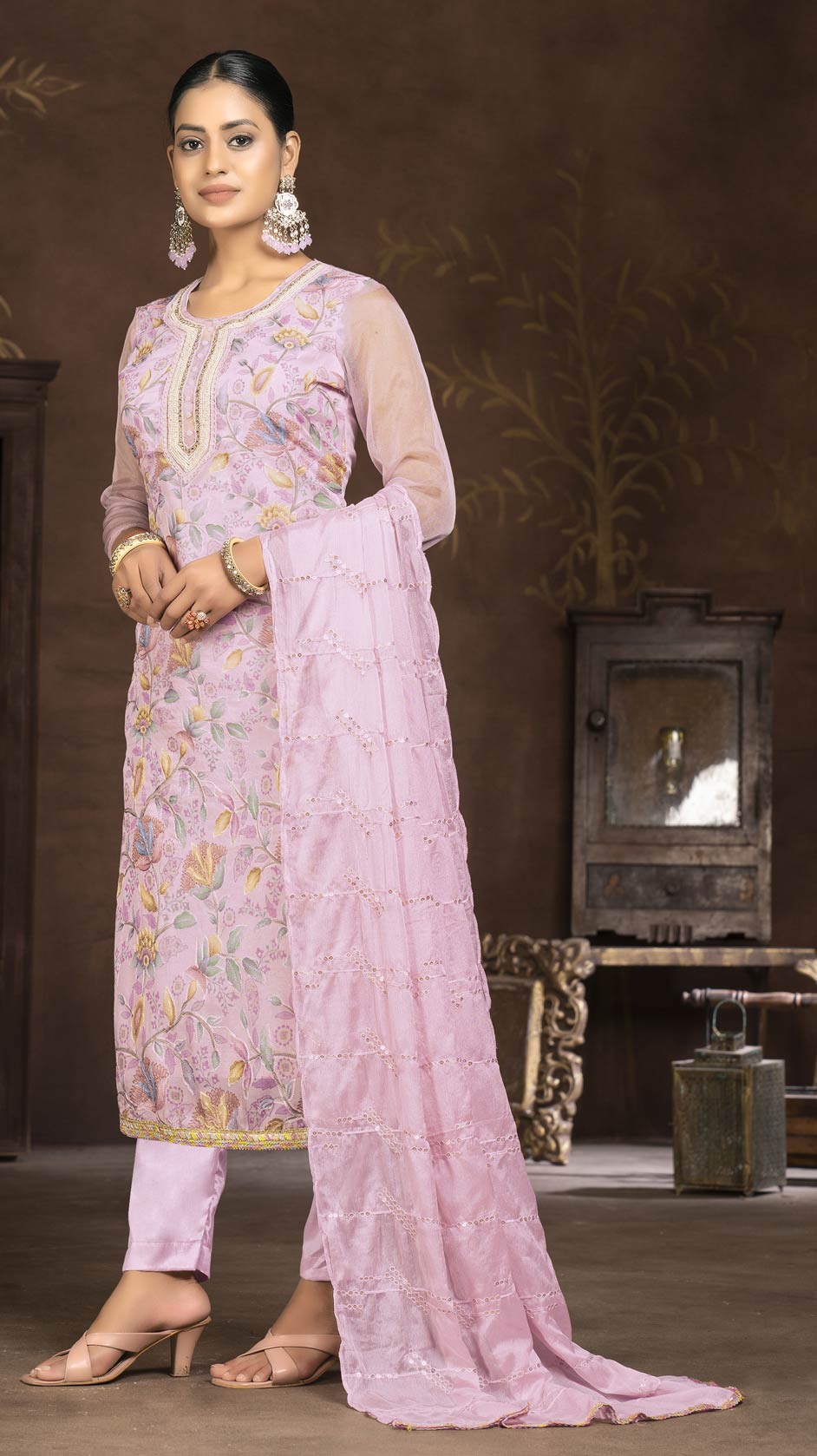 Organza Silk Party Wear Salwar Kameez in Pink and Majenta with Printed work