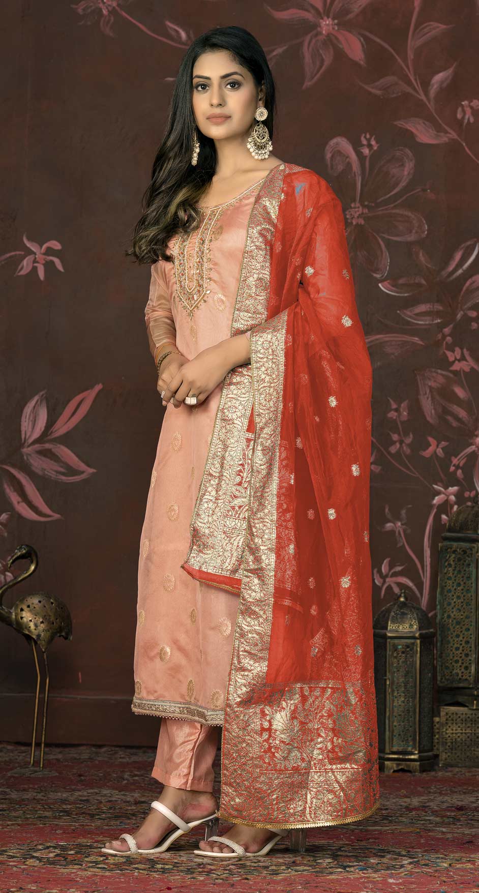 Chanderi Silk Party Wear Salwar Kameez in Pink and Majenta with Weaving work