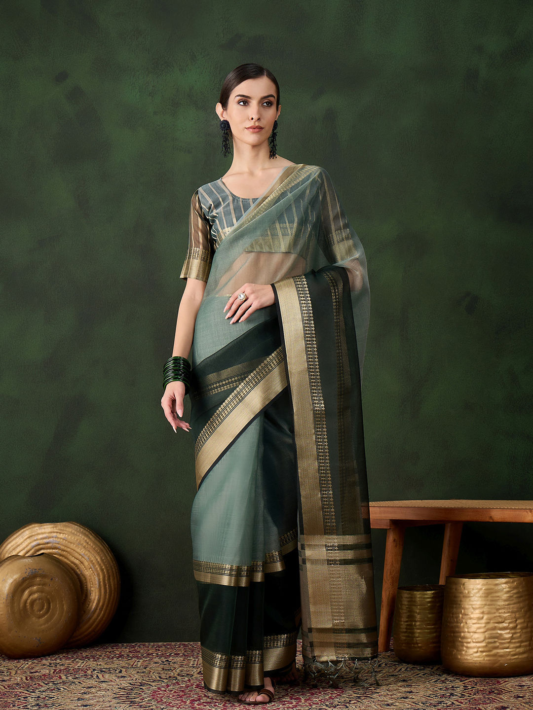 Organza Silk Traditional Saree in Black and Grey with Weaving work