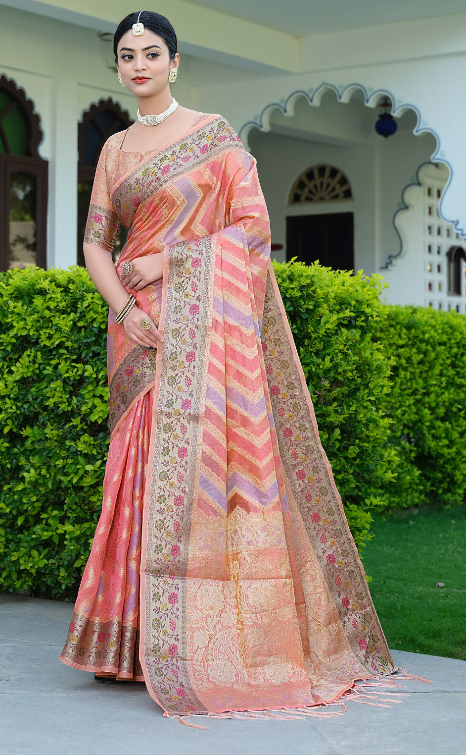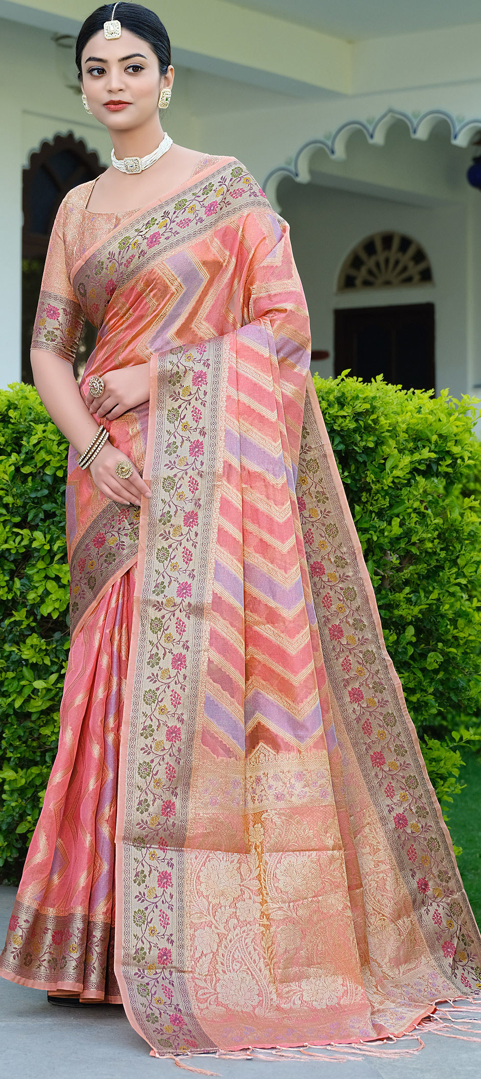 Pink and Majenta color Saree in Organza Silk, Silk fabric with Weaving work