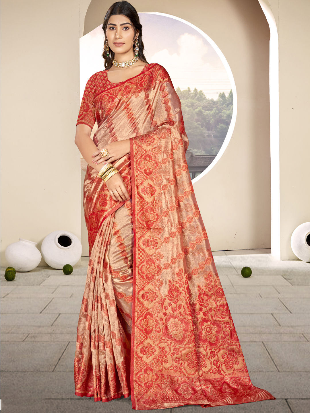 Red and Maroon color Saree in Organza Silk fabric with Weaving work