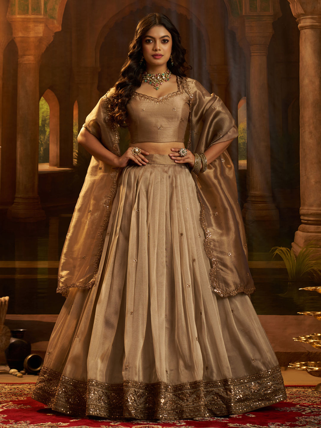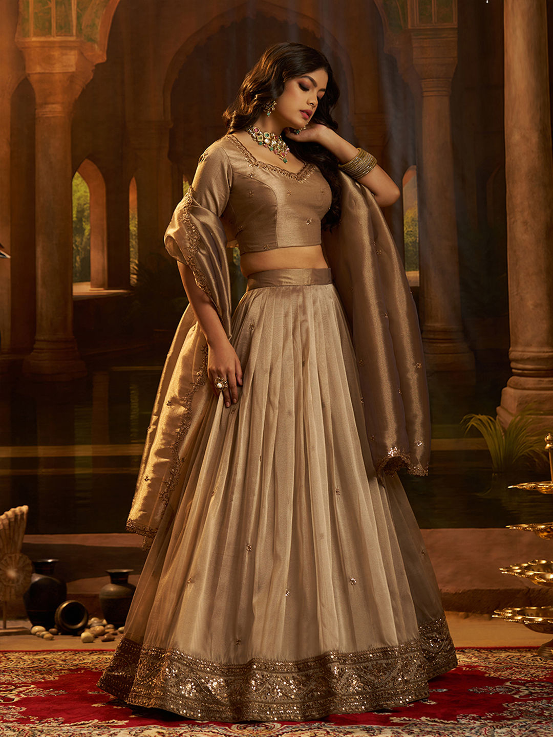 Beige and Brown color Lehenga in Organza Silk fabric with Sequence, Zari work