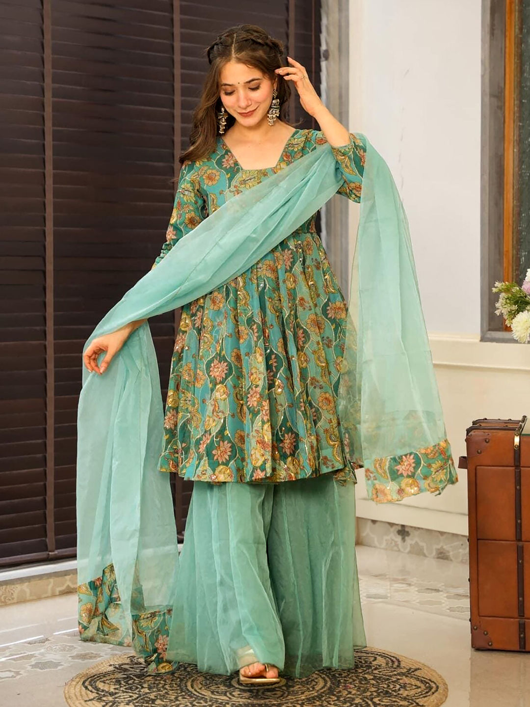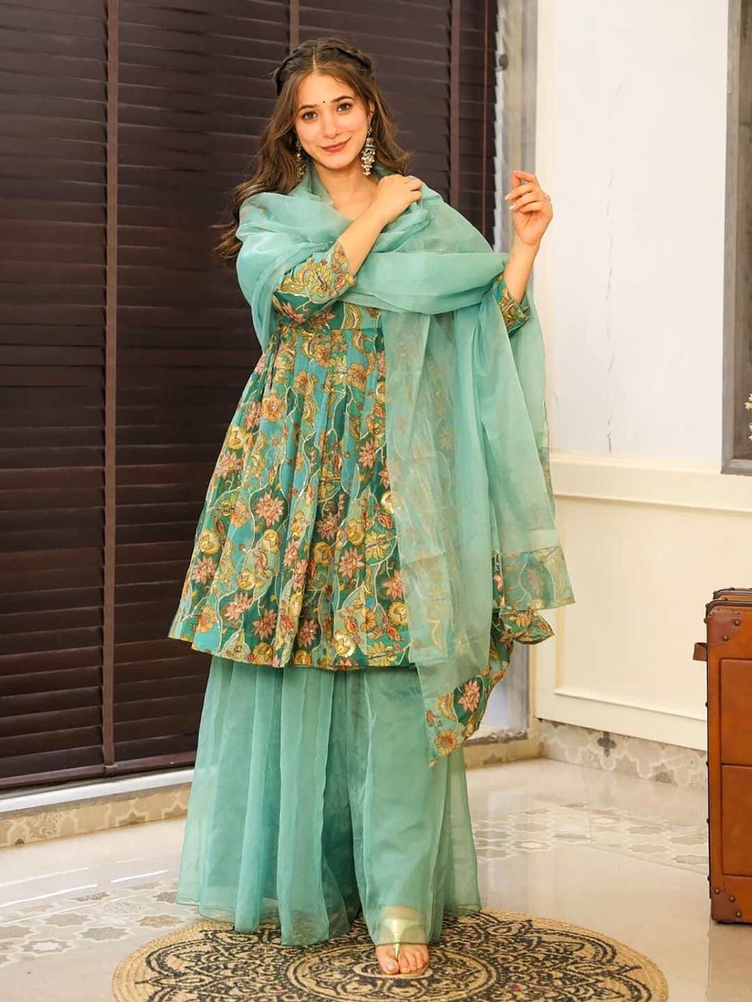 Green color Salwar Kameez in Organza Silk fabric with Digital Print, Floral work