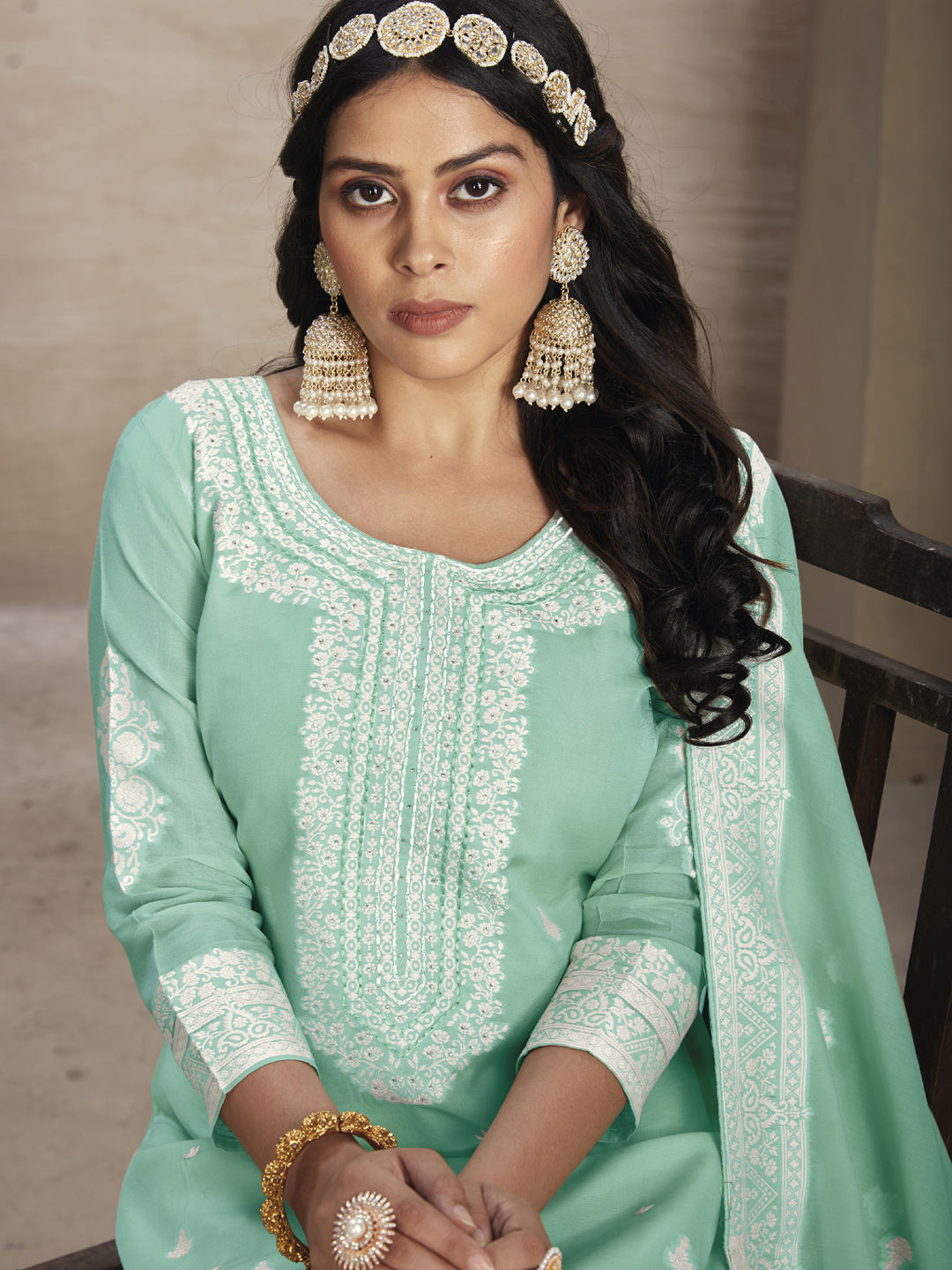 Green color Salwar Kameez in Organza Silk fabric with Bugle Beads, Embroidered, Thread work