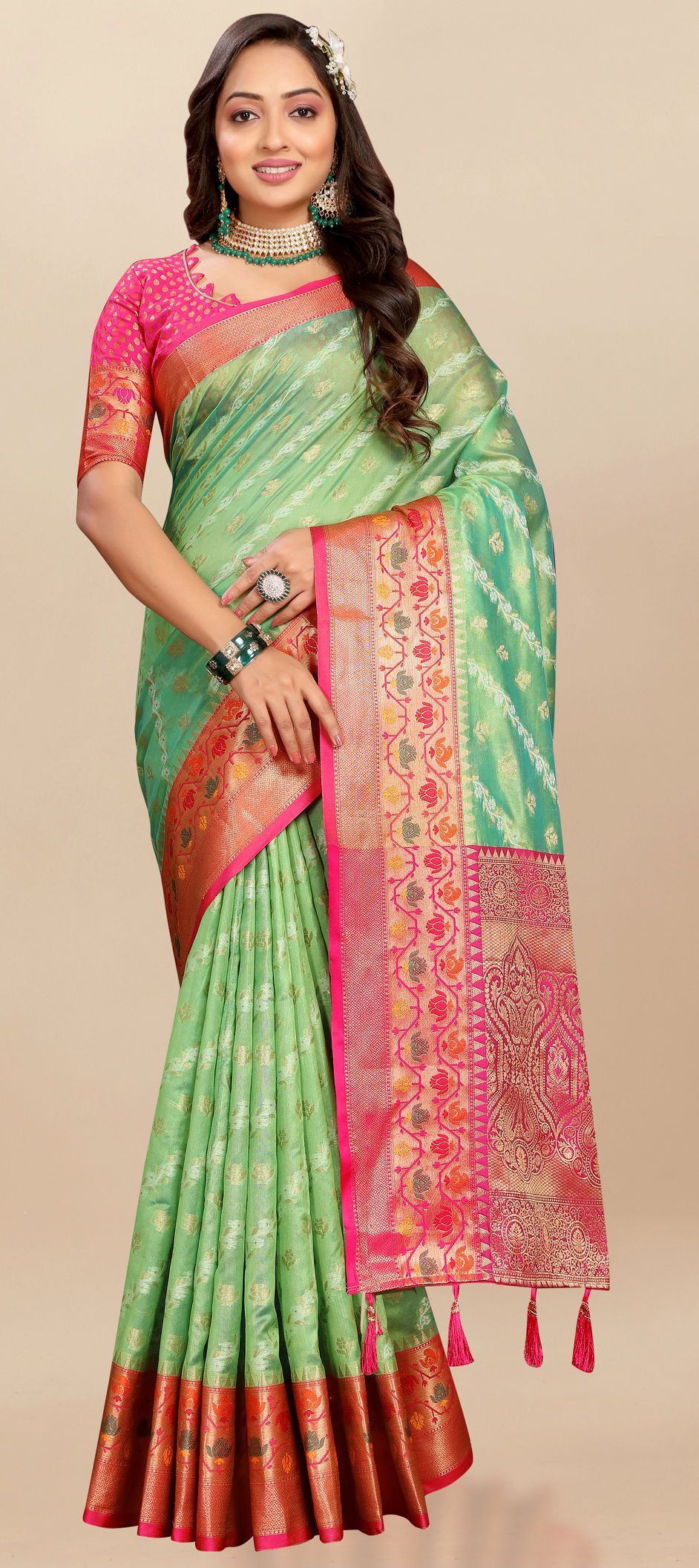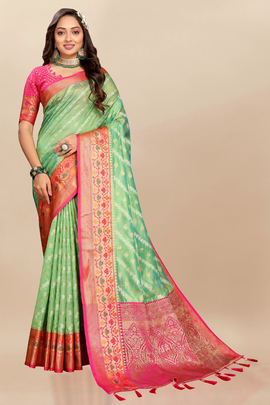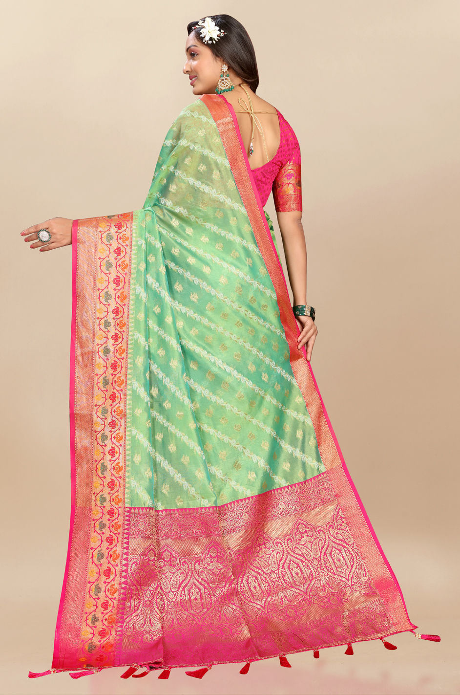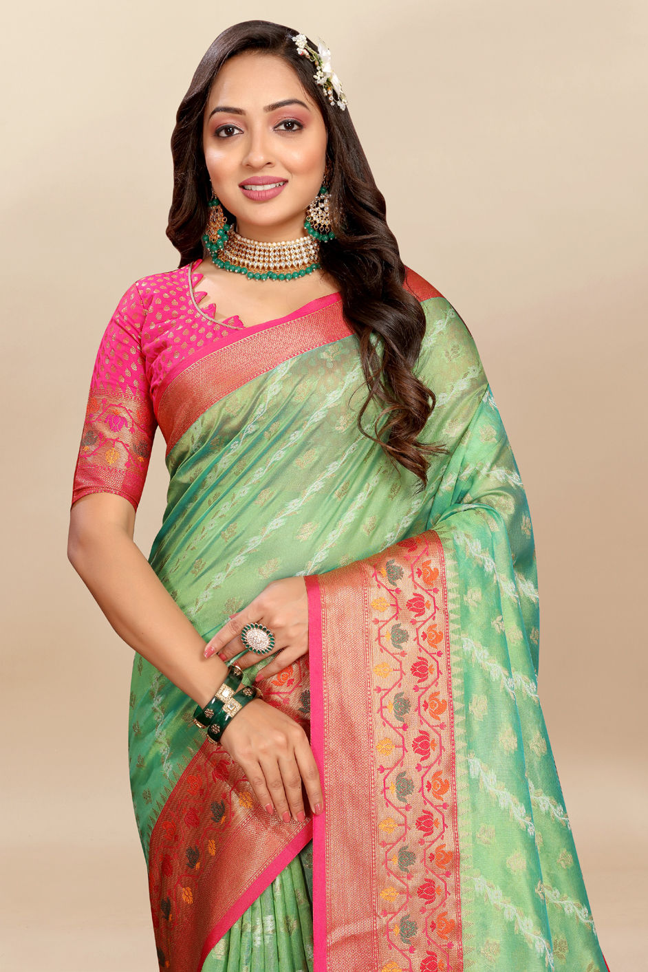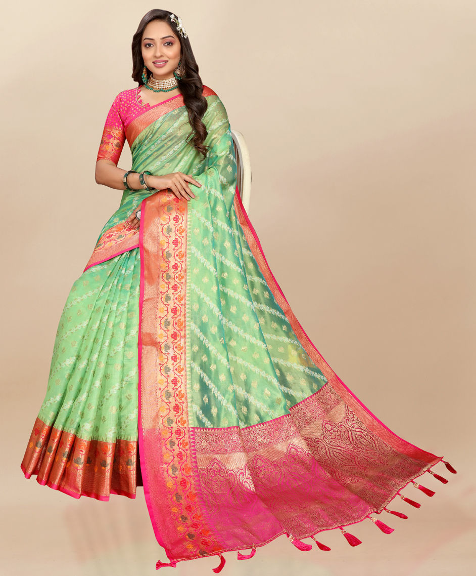 Green color Saree in Organza Silk fabric with Weaving, Zari work