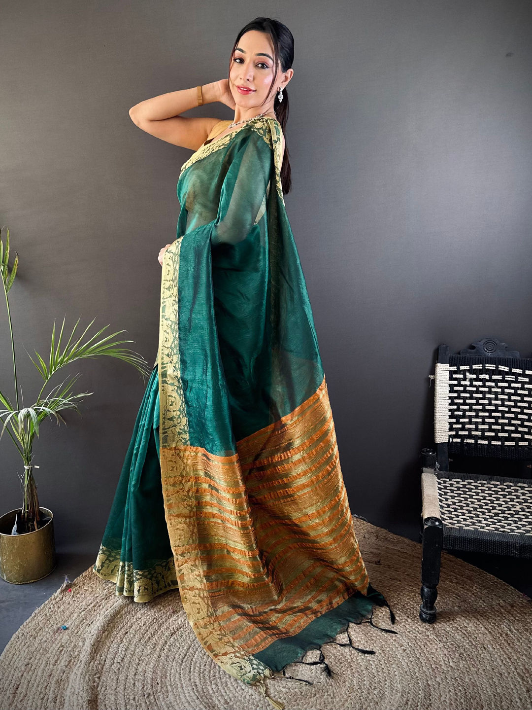 Green color Saree in Organza Silk fabric with Embroidered, Weaving, Zari work