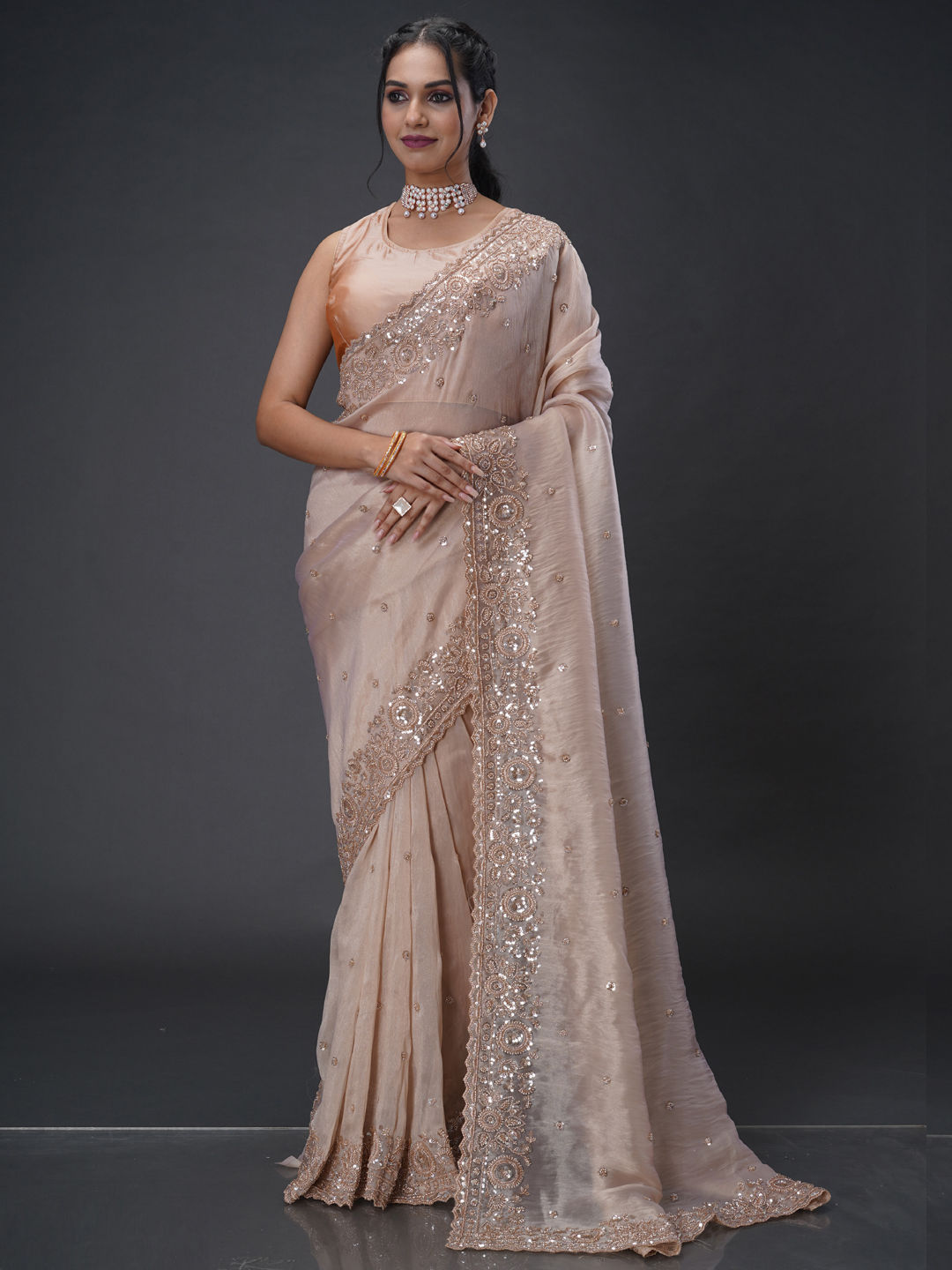 Beige and Brown color Saree in Organza Silk fabric with Bugle Beads, Cut Dana, Sequence work