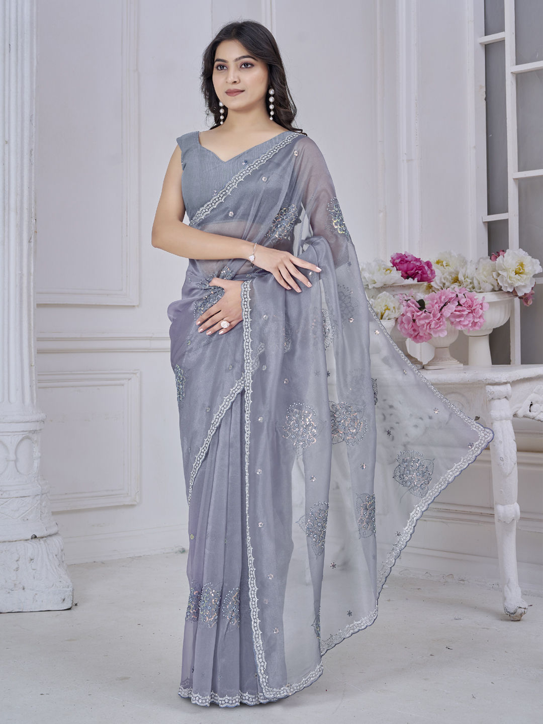 Black and Grey color Saree in Organza Silk fabric with Moti, Sequence, Thread work