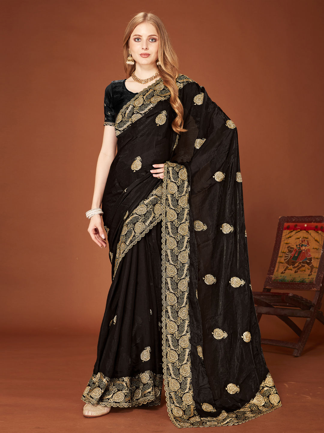 Black and Grey color Saree in Organza Silk fabric with Embroidered, Zari, Zircon work