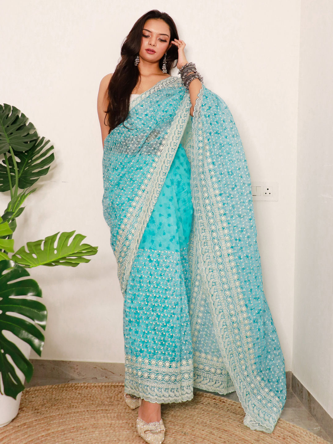 Blue color Saree in Organza Silk fabric with Embroidered, Resham, Thread work