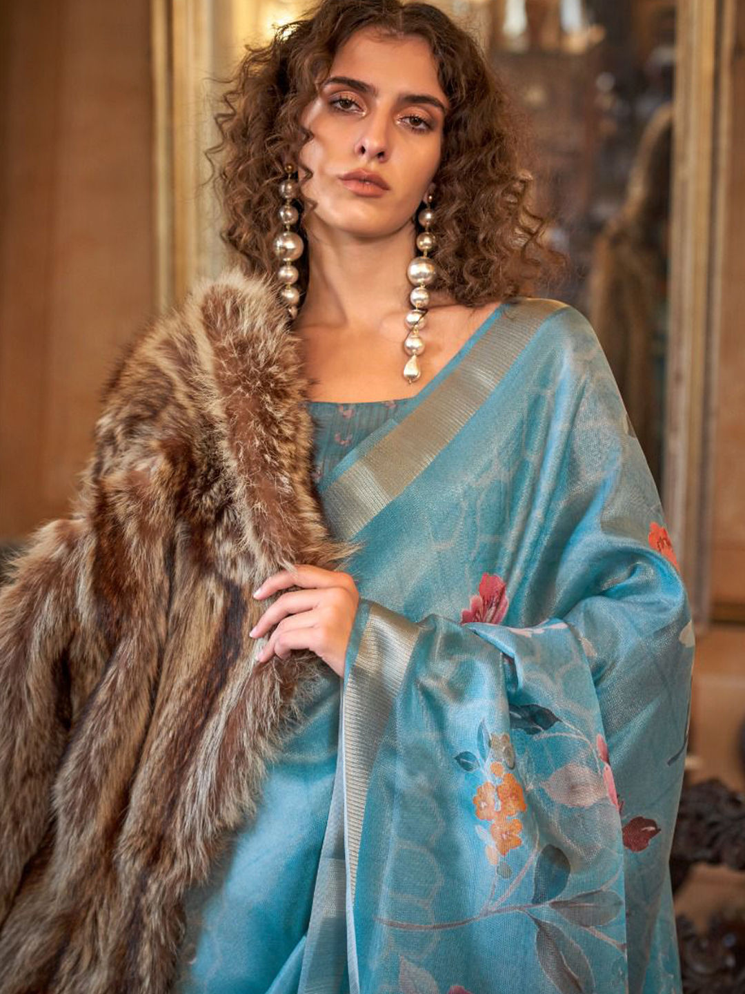 Blue color Saree in Organza Silk fabric with Digital Print, Floral, Weaving work