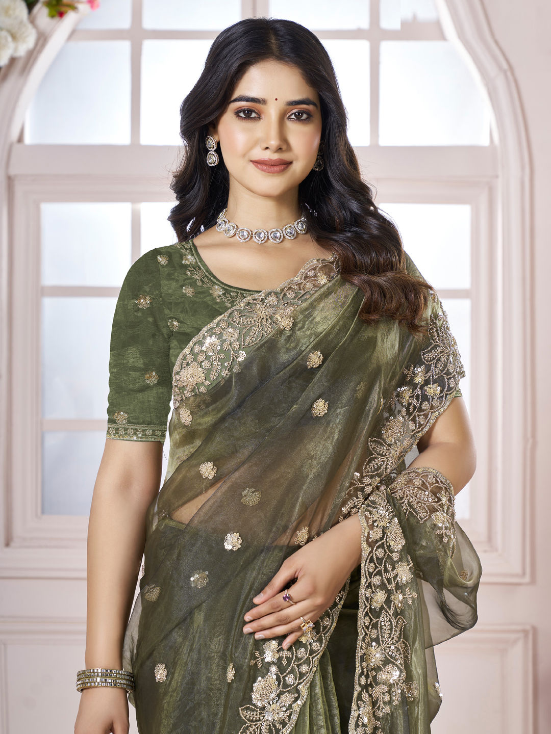 Green color Saree in Organza Silk fabric with Bugle Beads, Cut Dana, Sequence work