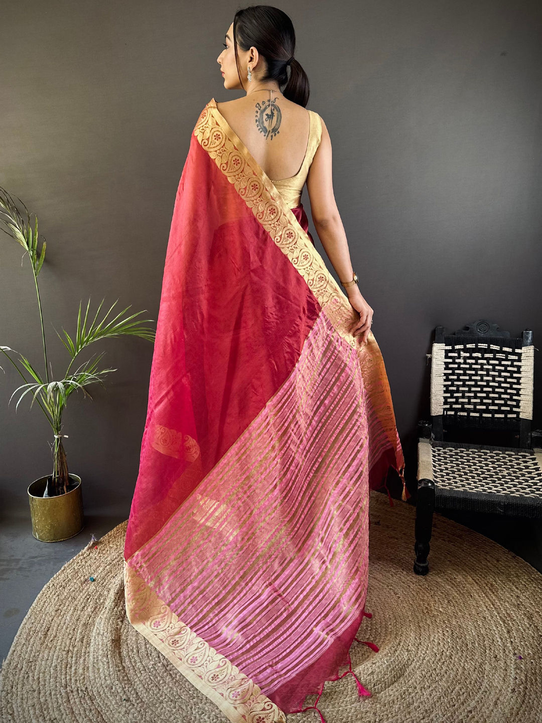 Red and Maroon color Saree in Organza Silk fabric with Embroidered, Weaving, Zari work