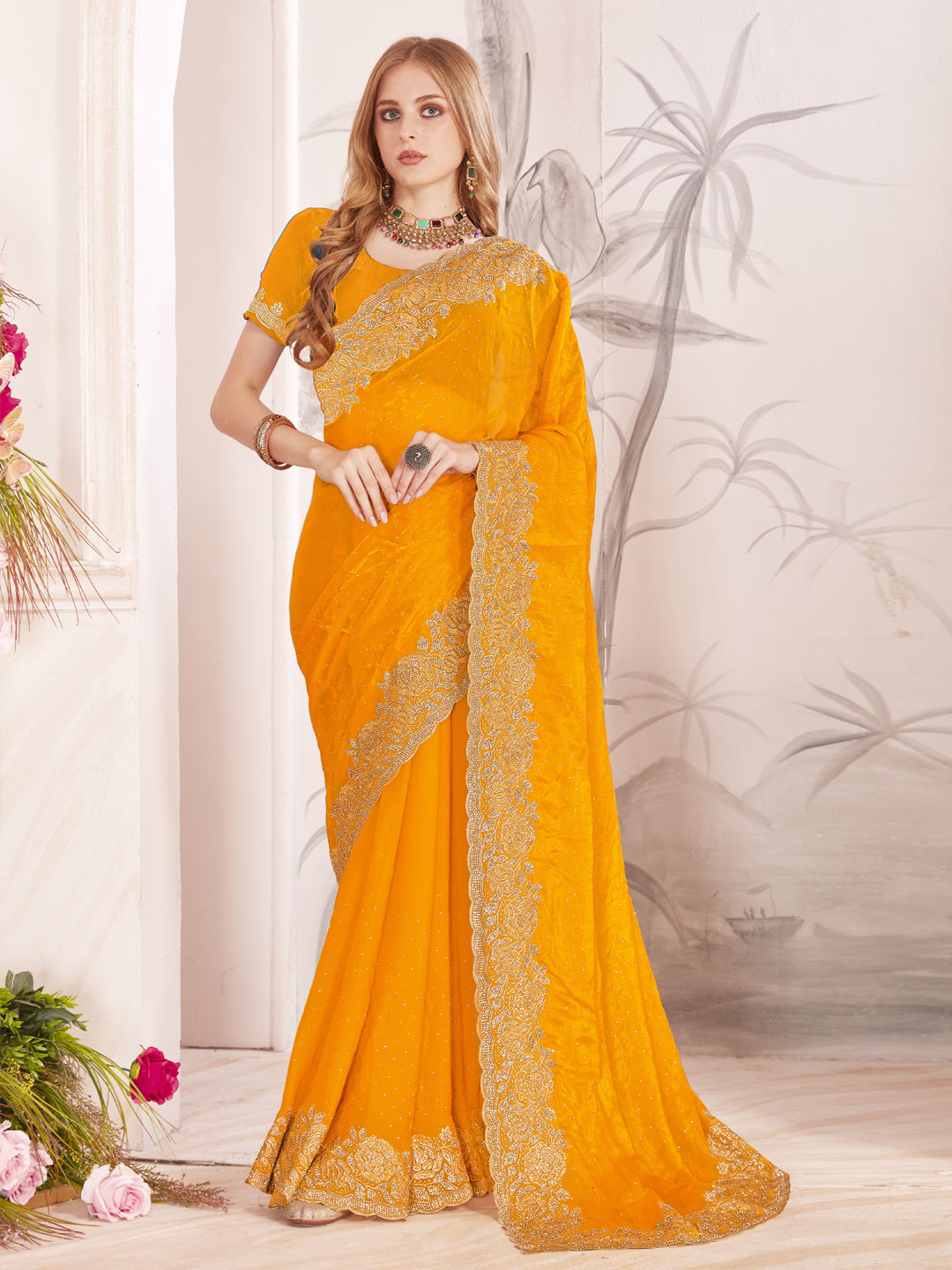 Yellow color Saree in Organza Silk fabric with Embroidered, Stone, Thread, Zari work