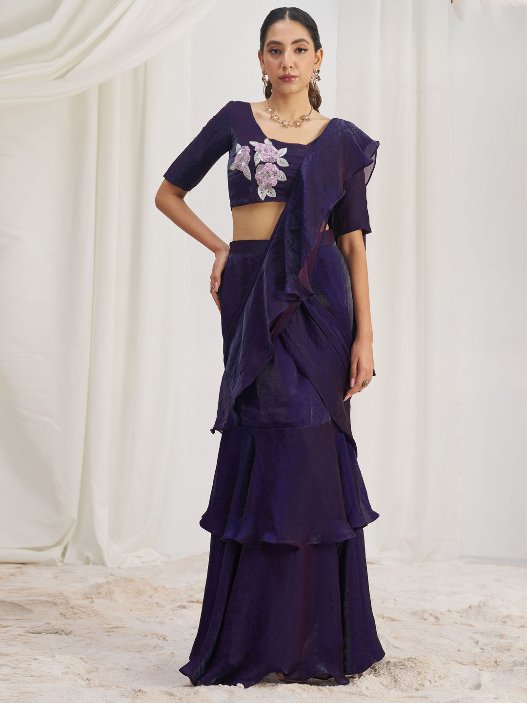 Purple and Violet color Readymade Saree in Organza Silk fabric with Cut Dana, Thread work