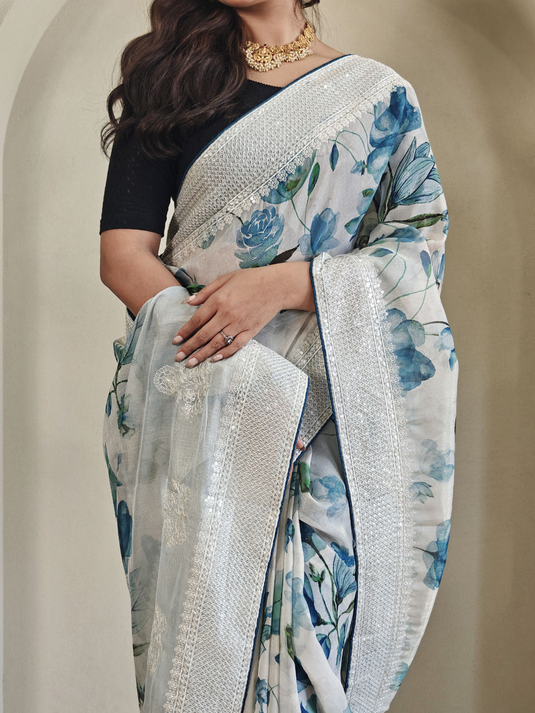 Black and Grey color Saree in Organza Silk fabric with Embroidered, Floral, Printed, Sequence, Thread work