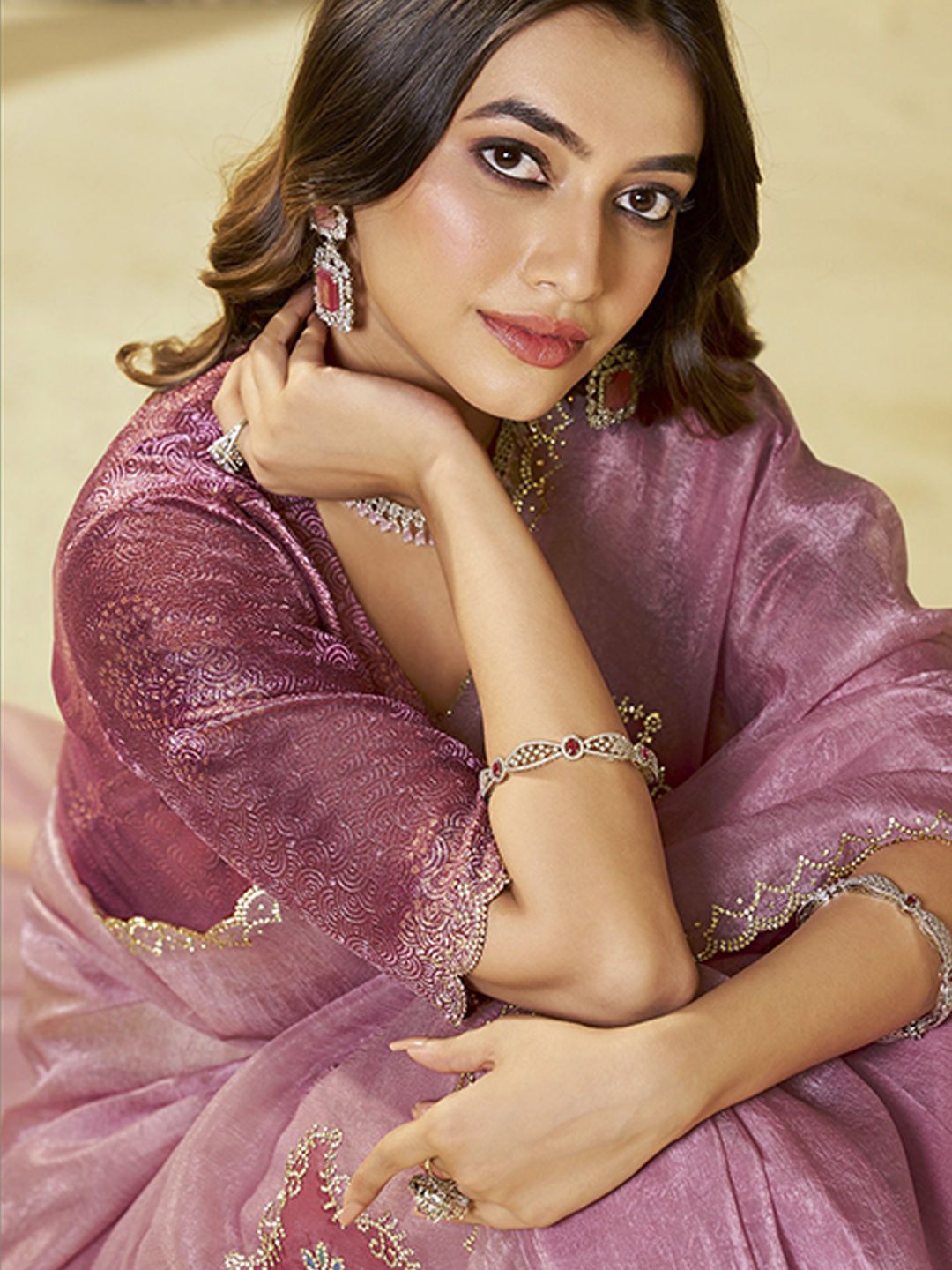 Pink and Majenta color Saree in Organza Silk fabric with Printed, Stone, Swarovski work