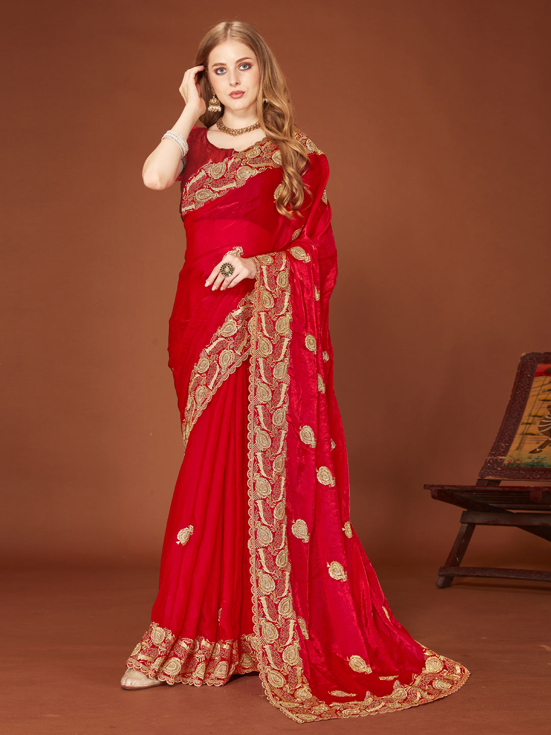 Red and Maroon color Saree in Organza Silk fabric with Embroidered, Zari, Zircon work