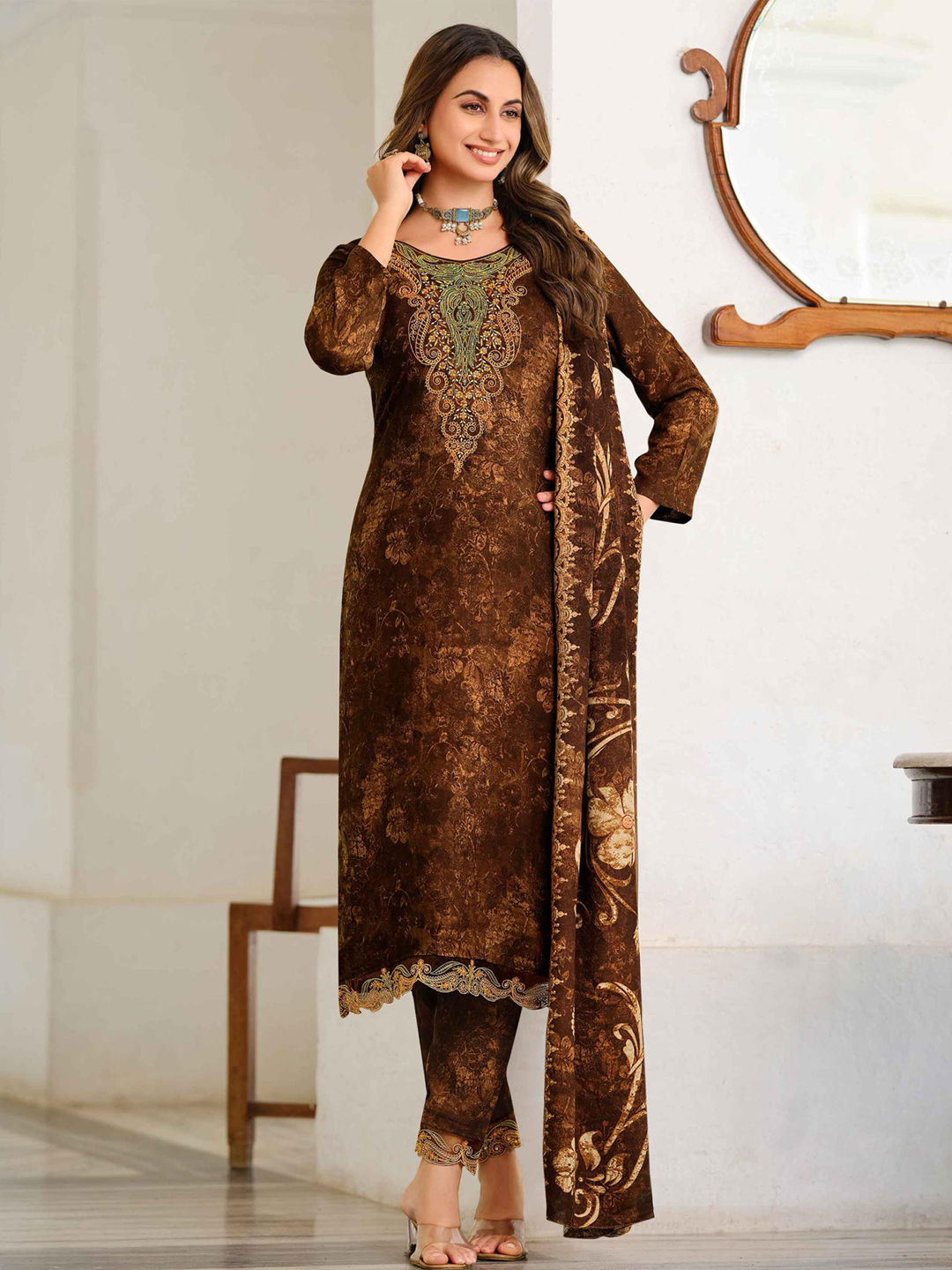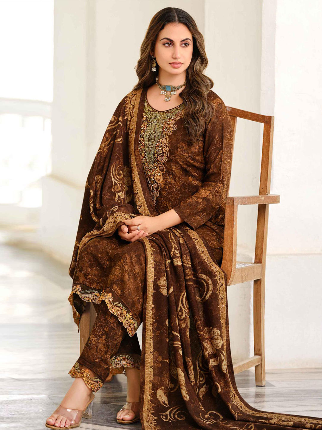 Beige and Brown color Salwar Kameez in Pashmina fabric with Embroidered work