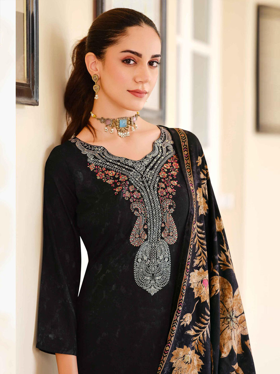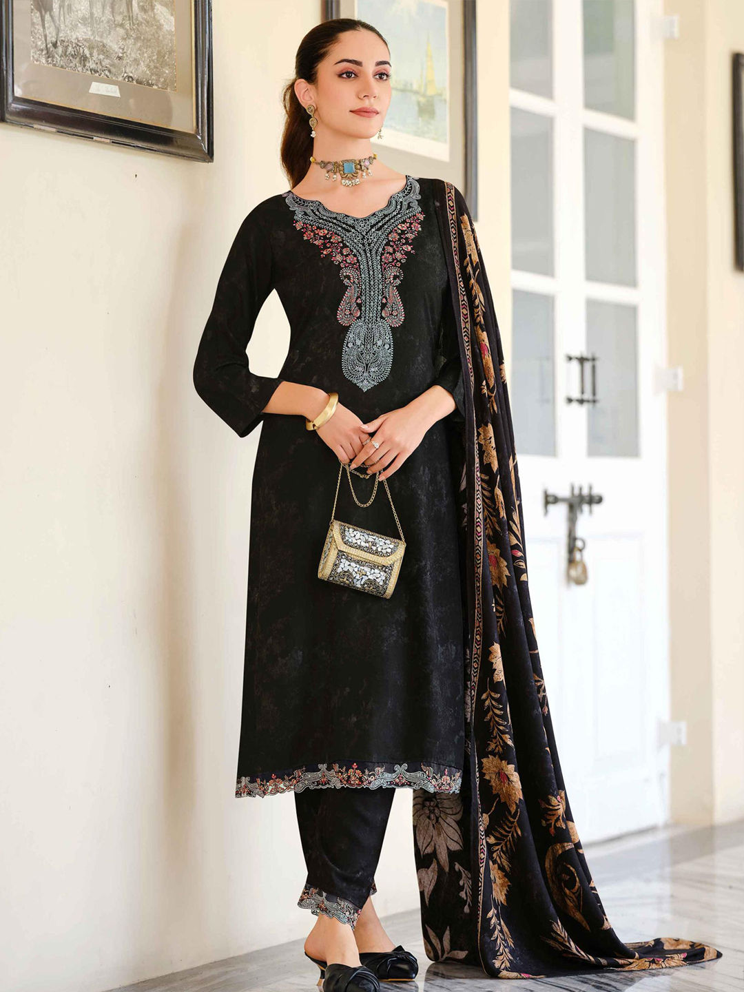 Black and Grey color Salwar Kameez in Pashmina fabric with Embroidered work