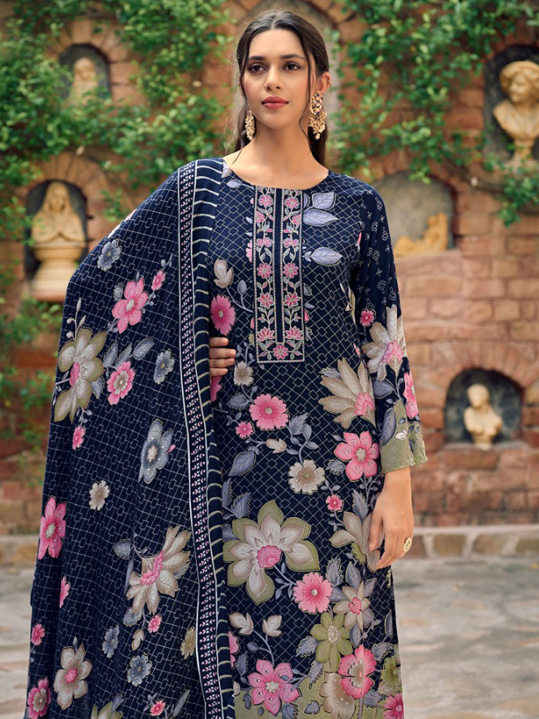 Blue color Salwar Kameez in Pashmina fabric with Digital Print, Embroidered, Floral work