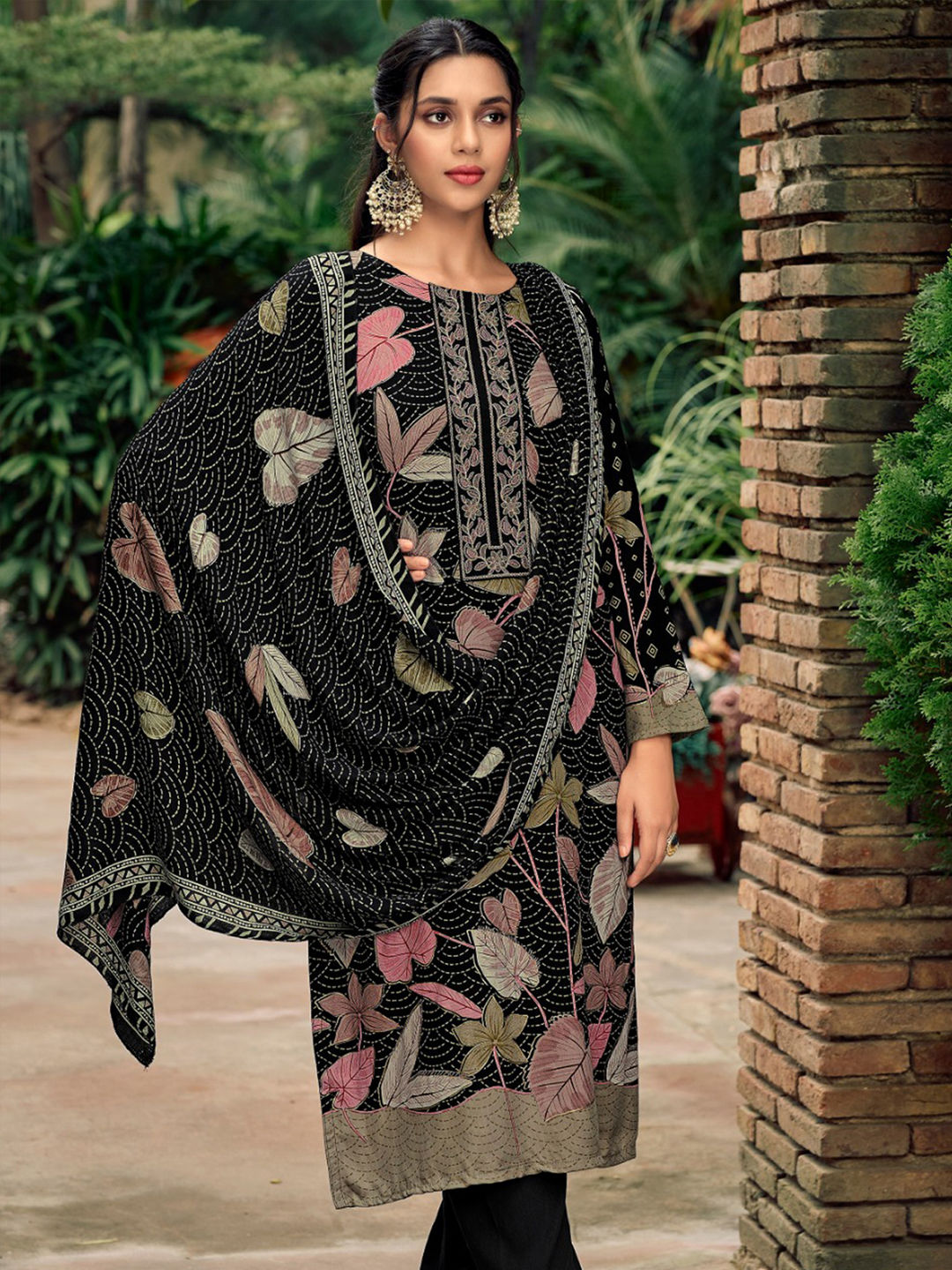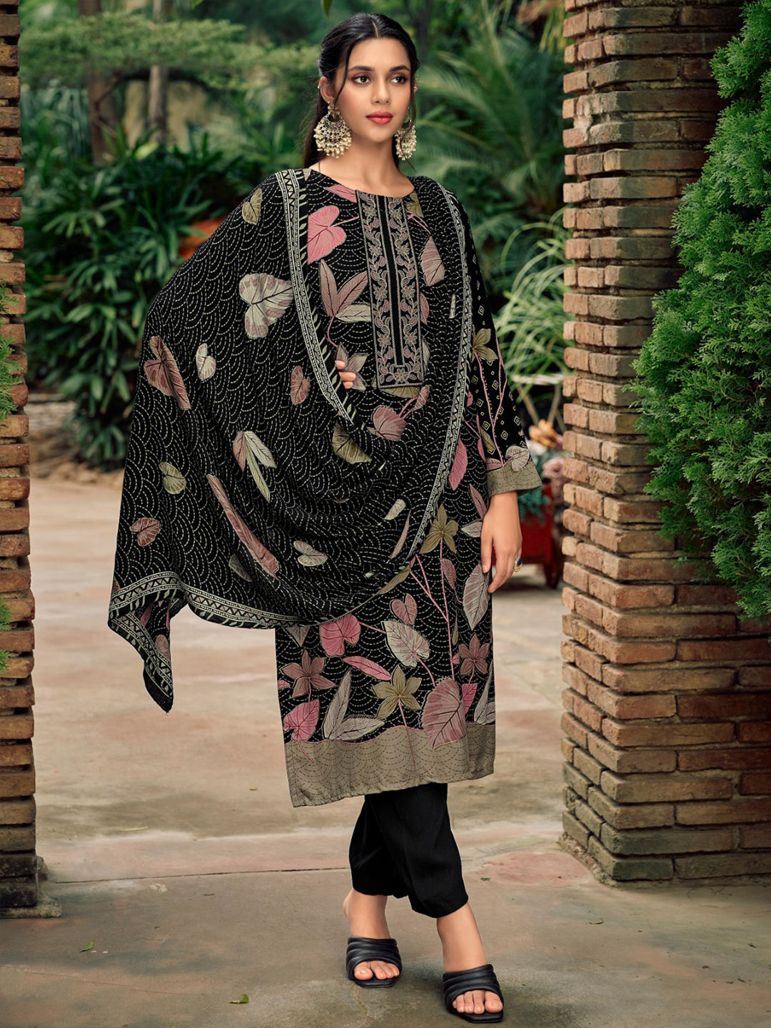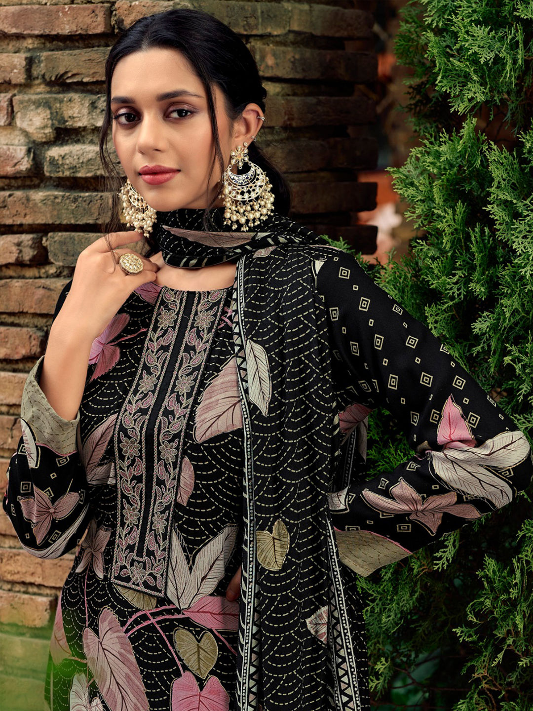 Black and Grey color Salwar Kameez in Pashmina fabric with Digital Print, Embroidered, Floral work
