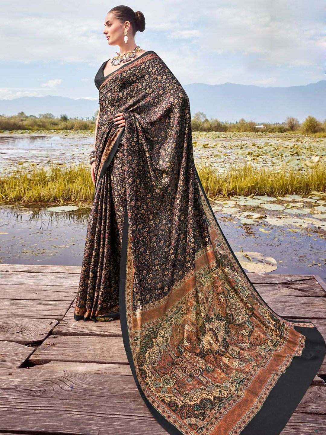 Black and Grey color Saree in Pashmina fabric with Printed work
