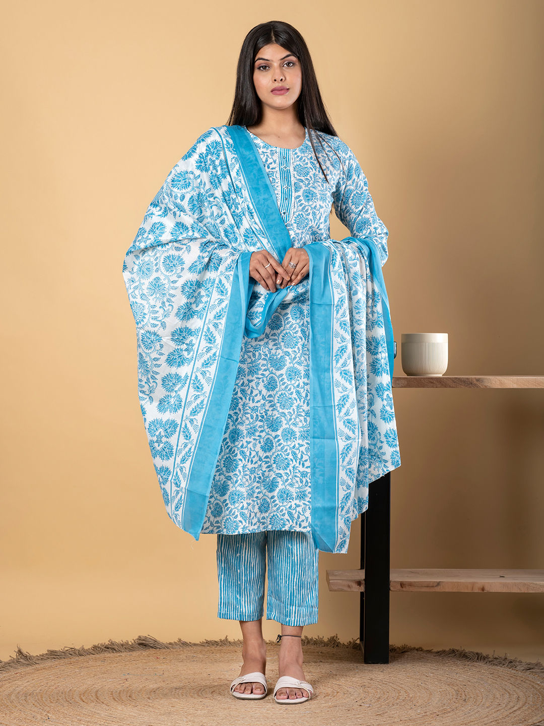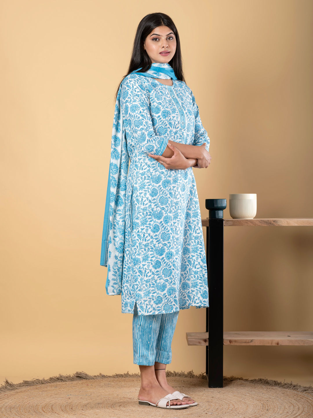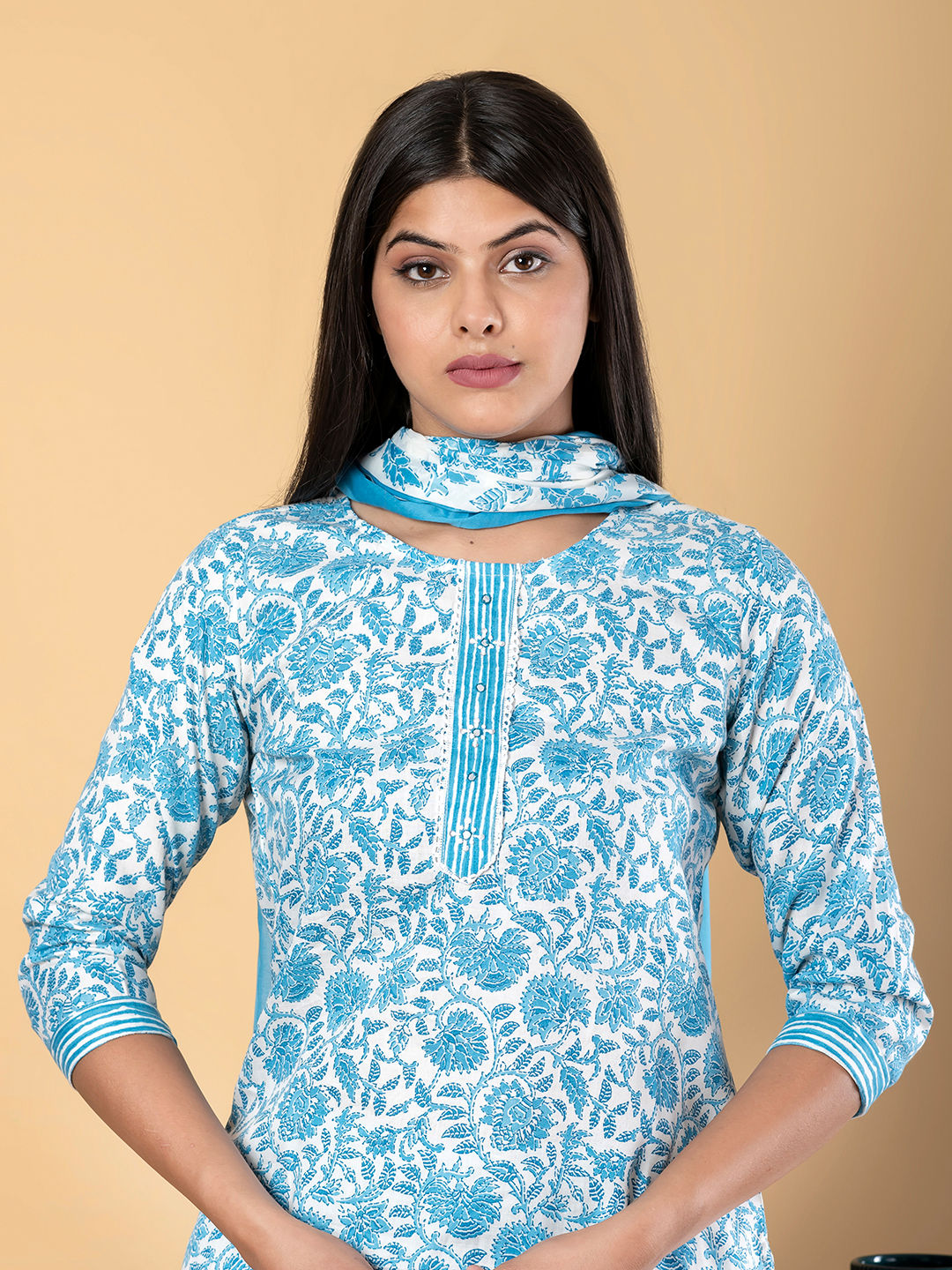 Blue, White and Off White color Salwar Kameez in Poly cotton fabric with Floral, Printed work
