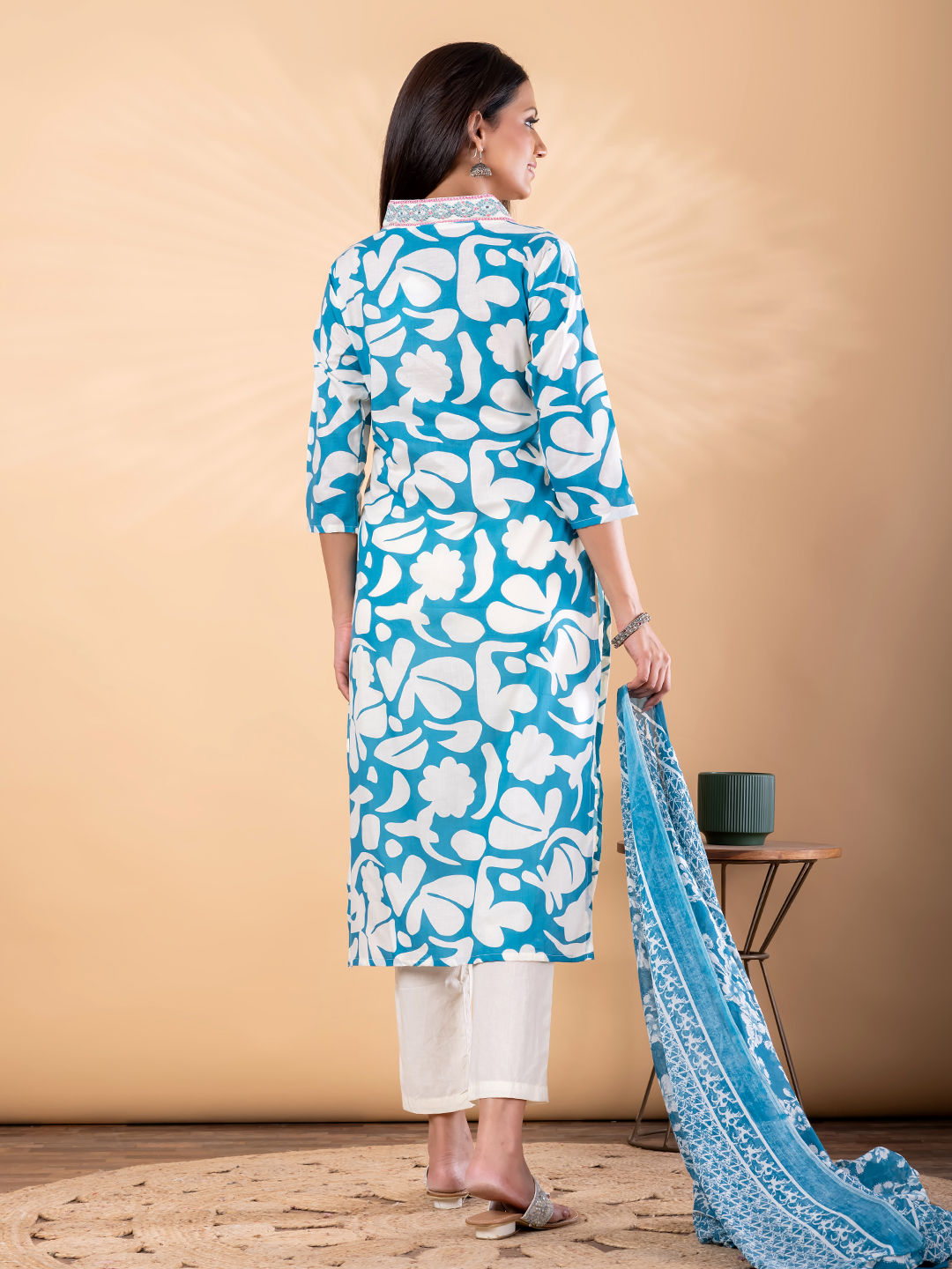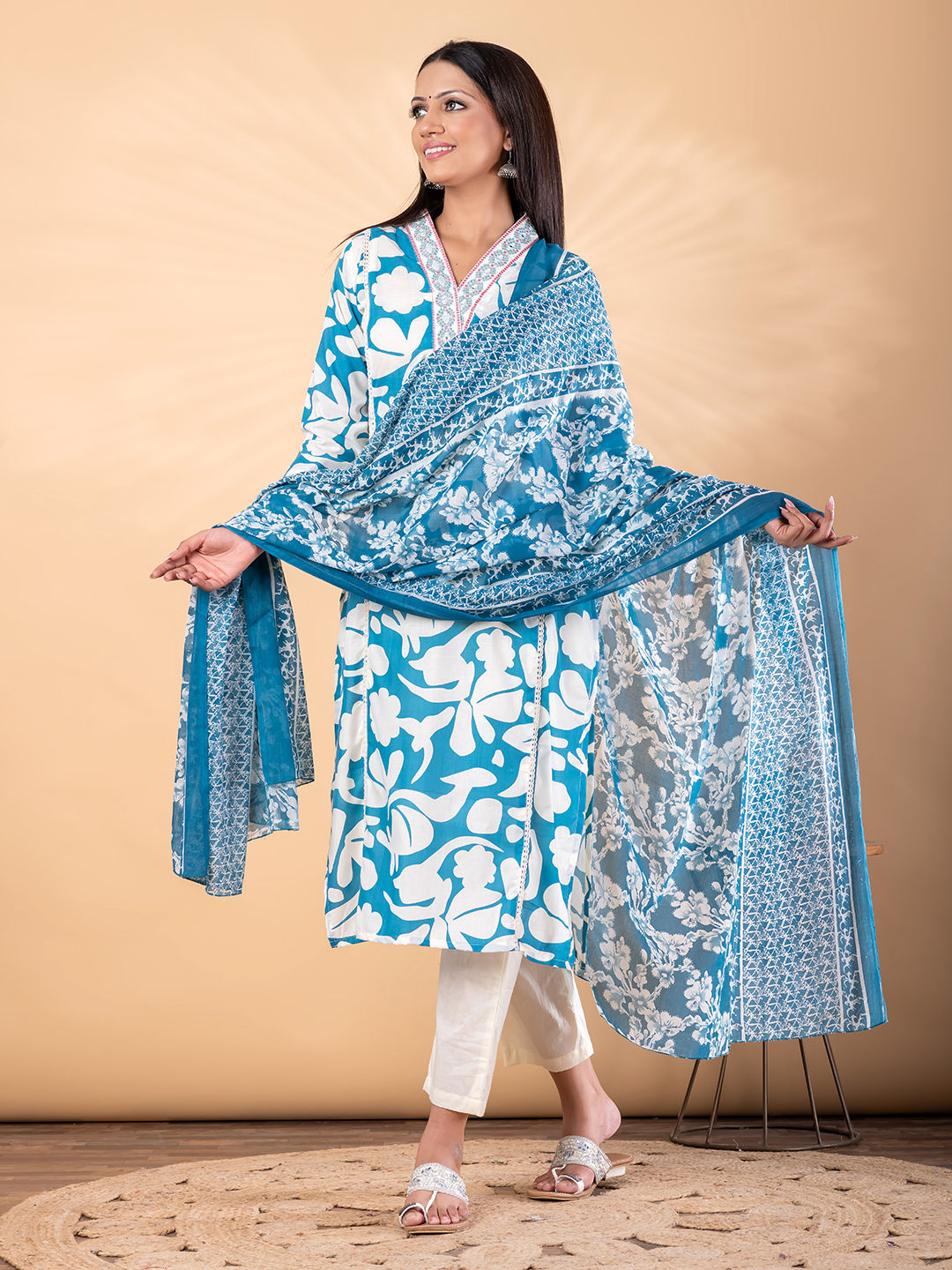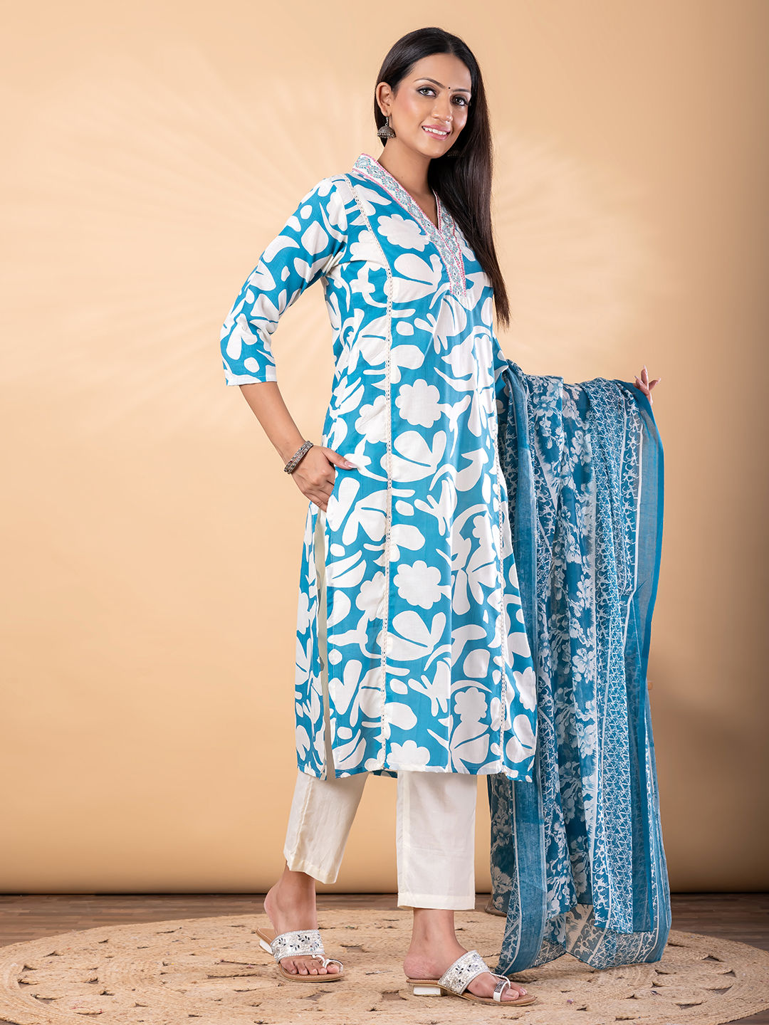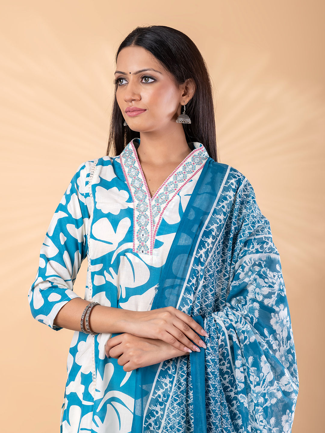Blue, White and Off White color Salwar Kameez in Poly cotton fabric with Embroidered, Printed, Resham work