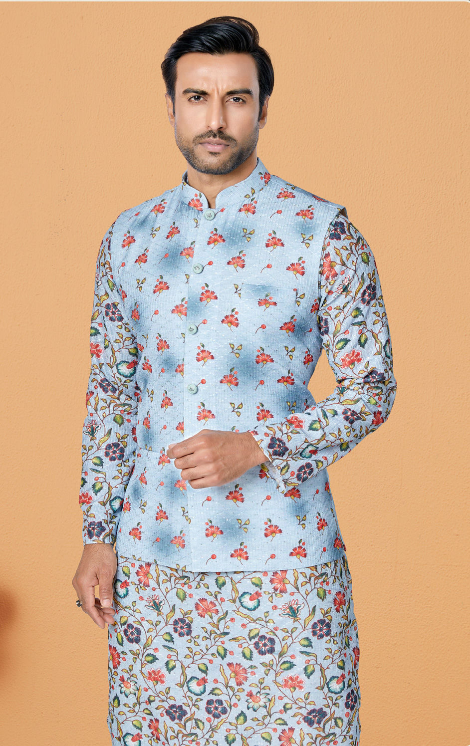 Blue color Nehru Jacket in Polyester Silk fabric with Printed work