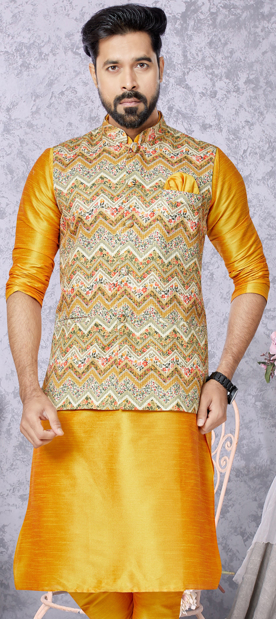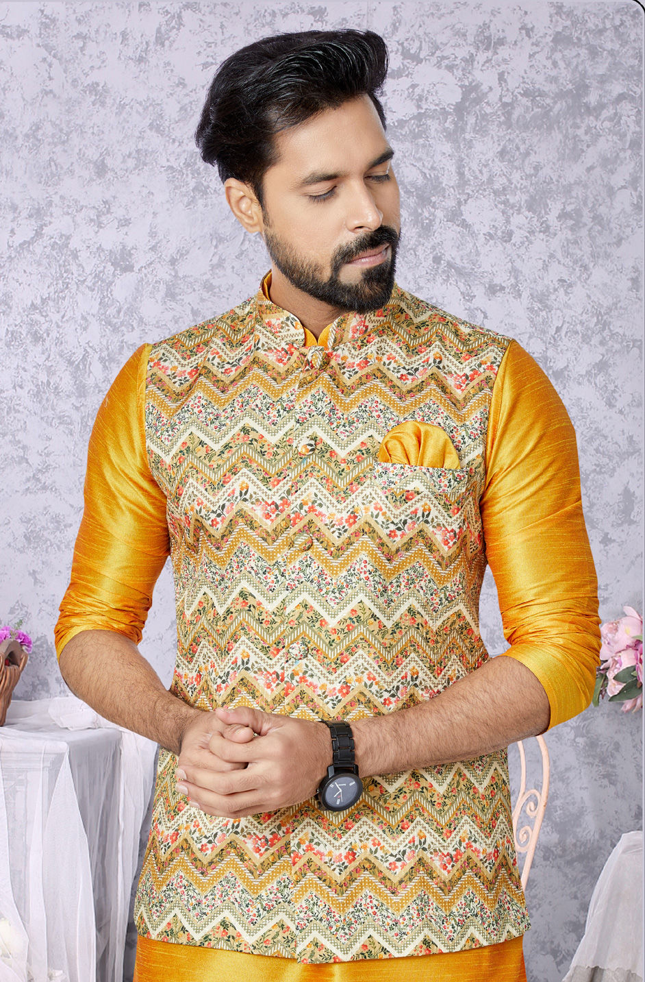 Cotton Party Wear Nehru Jacket in Yellow with Digital Print work