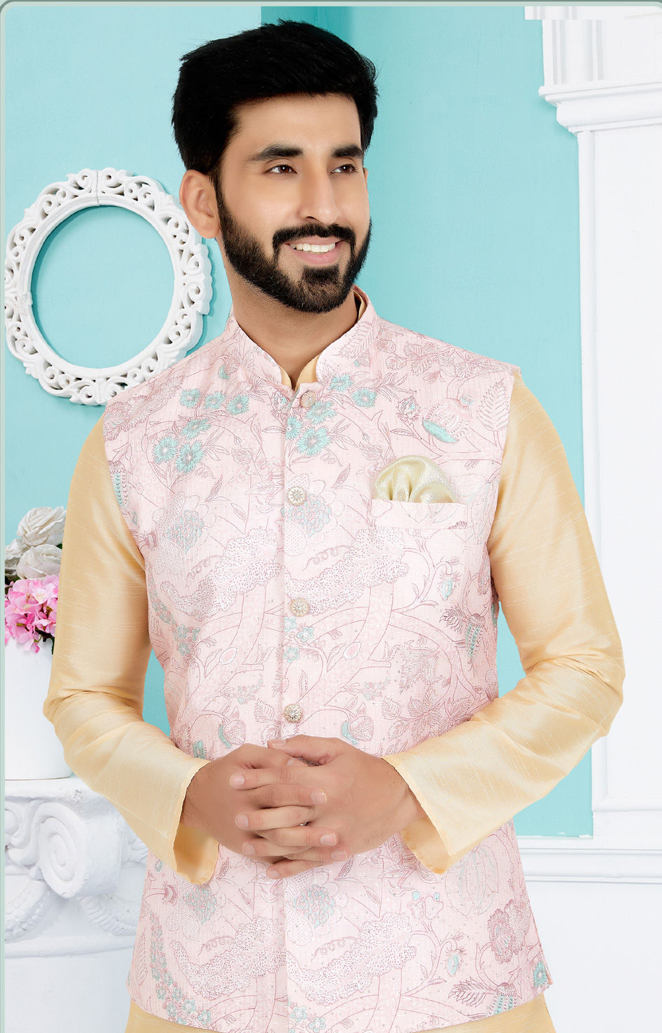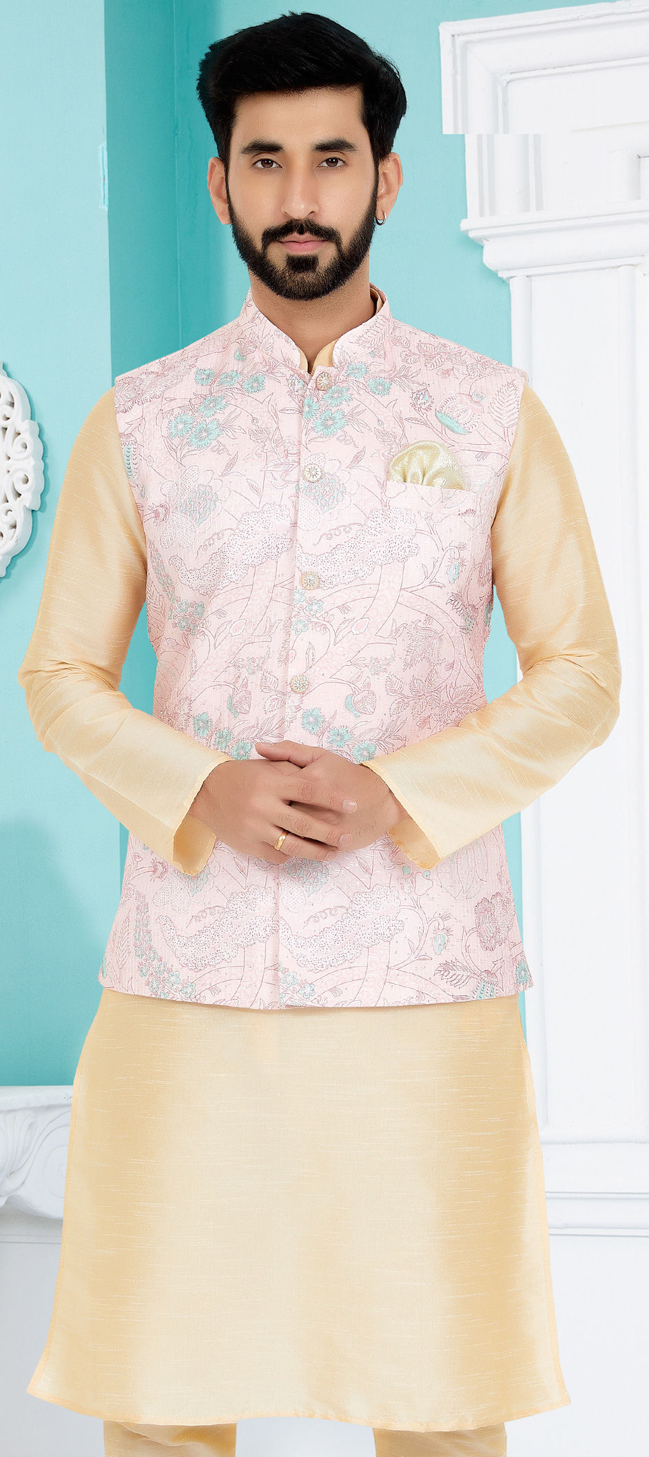 Pink and Majenta color Nehru Jacket in Polyester Silk fabric with Floral, Printed work