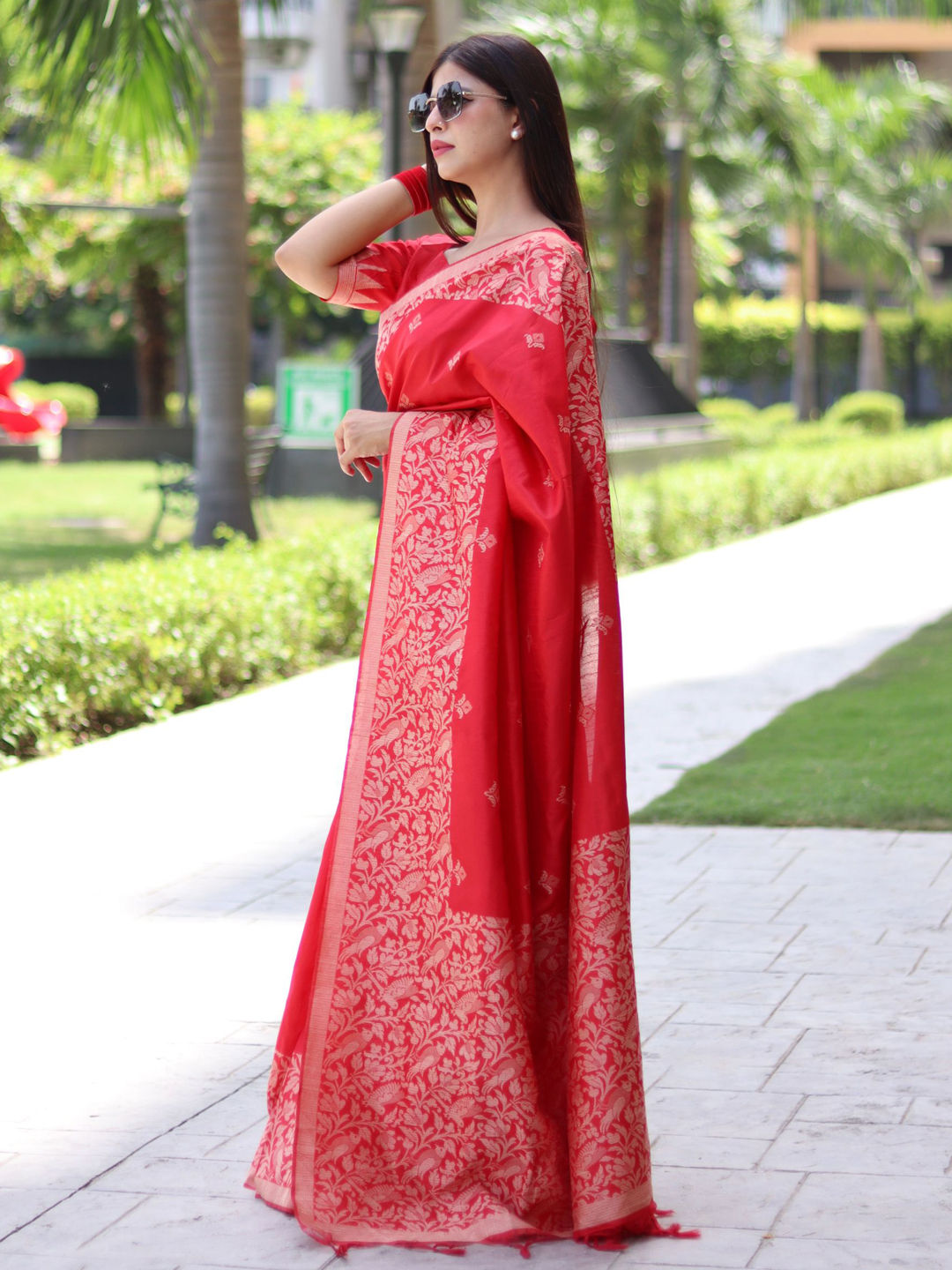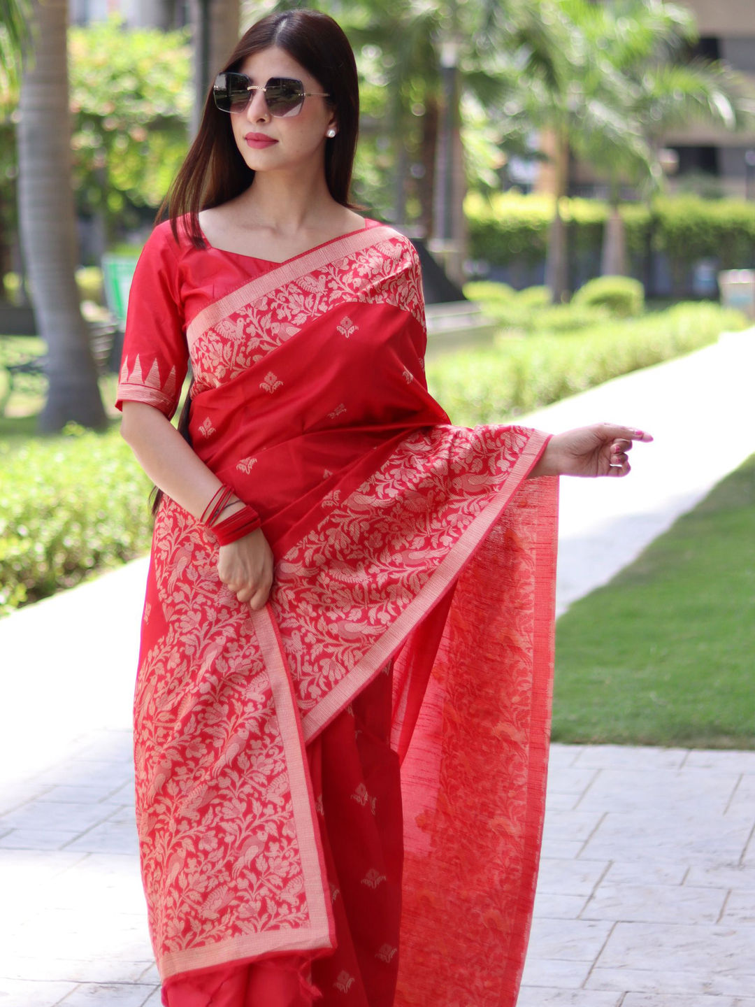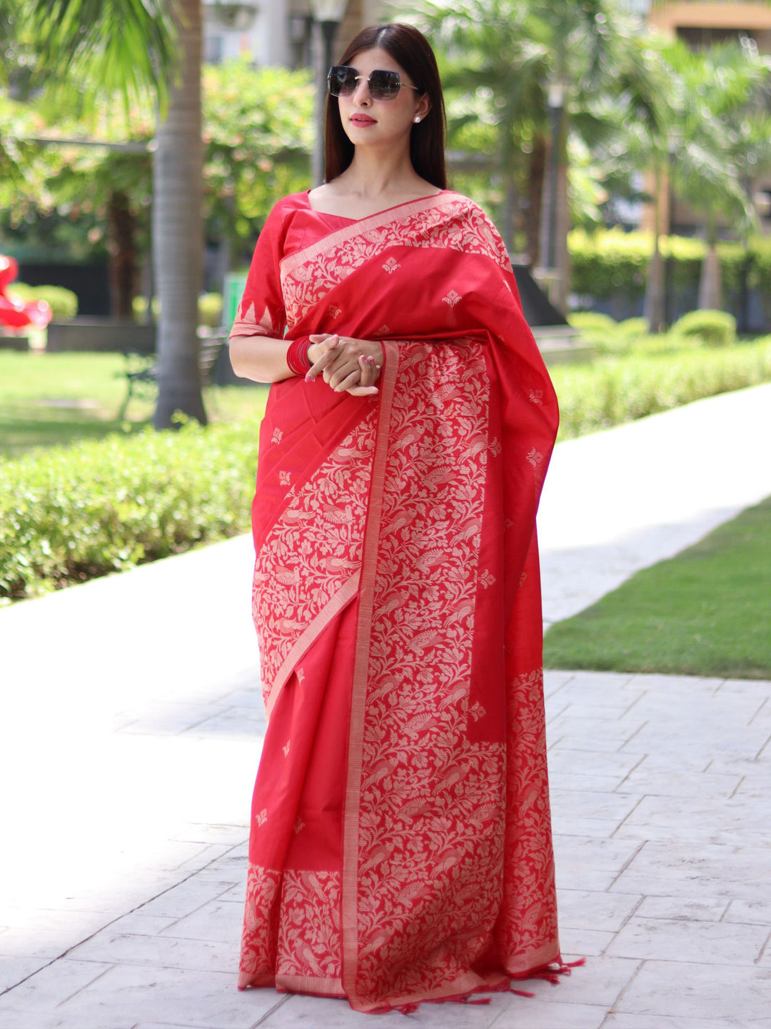 Red and Maroon color Saree in Raw Silk fabric with Weaving work