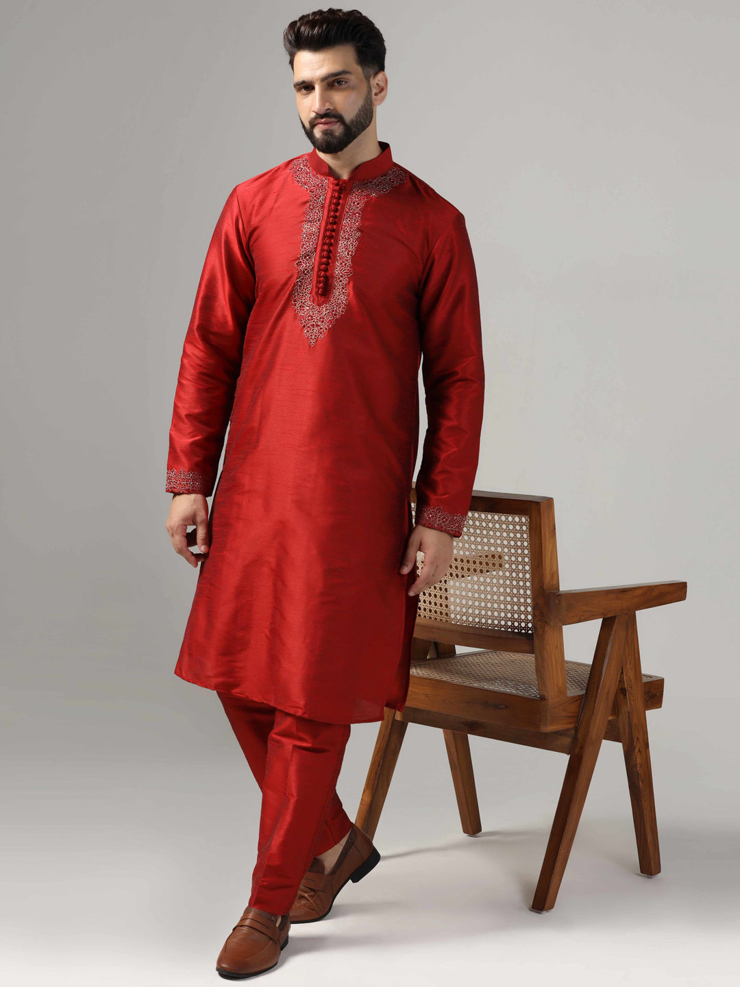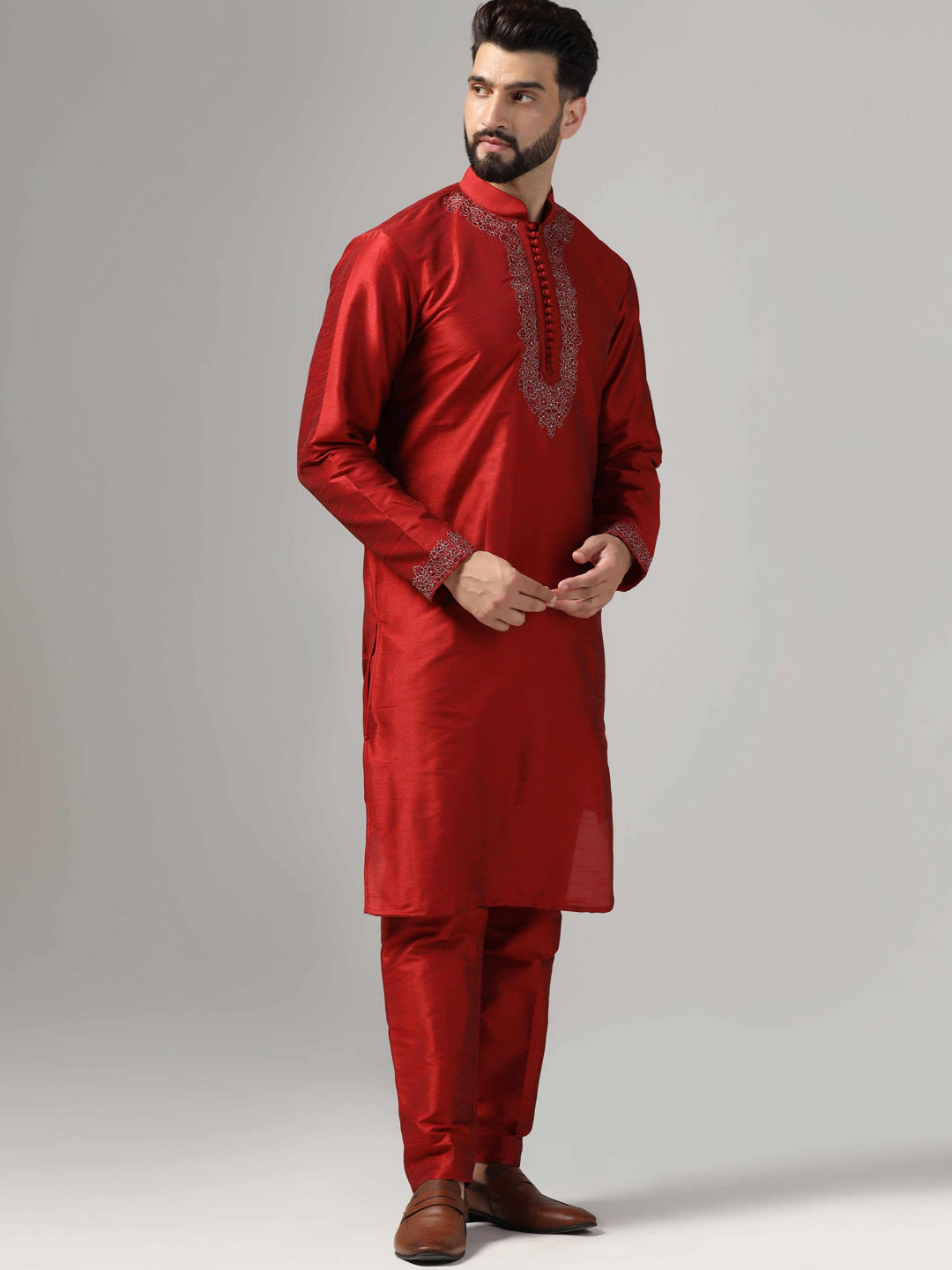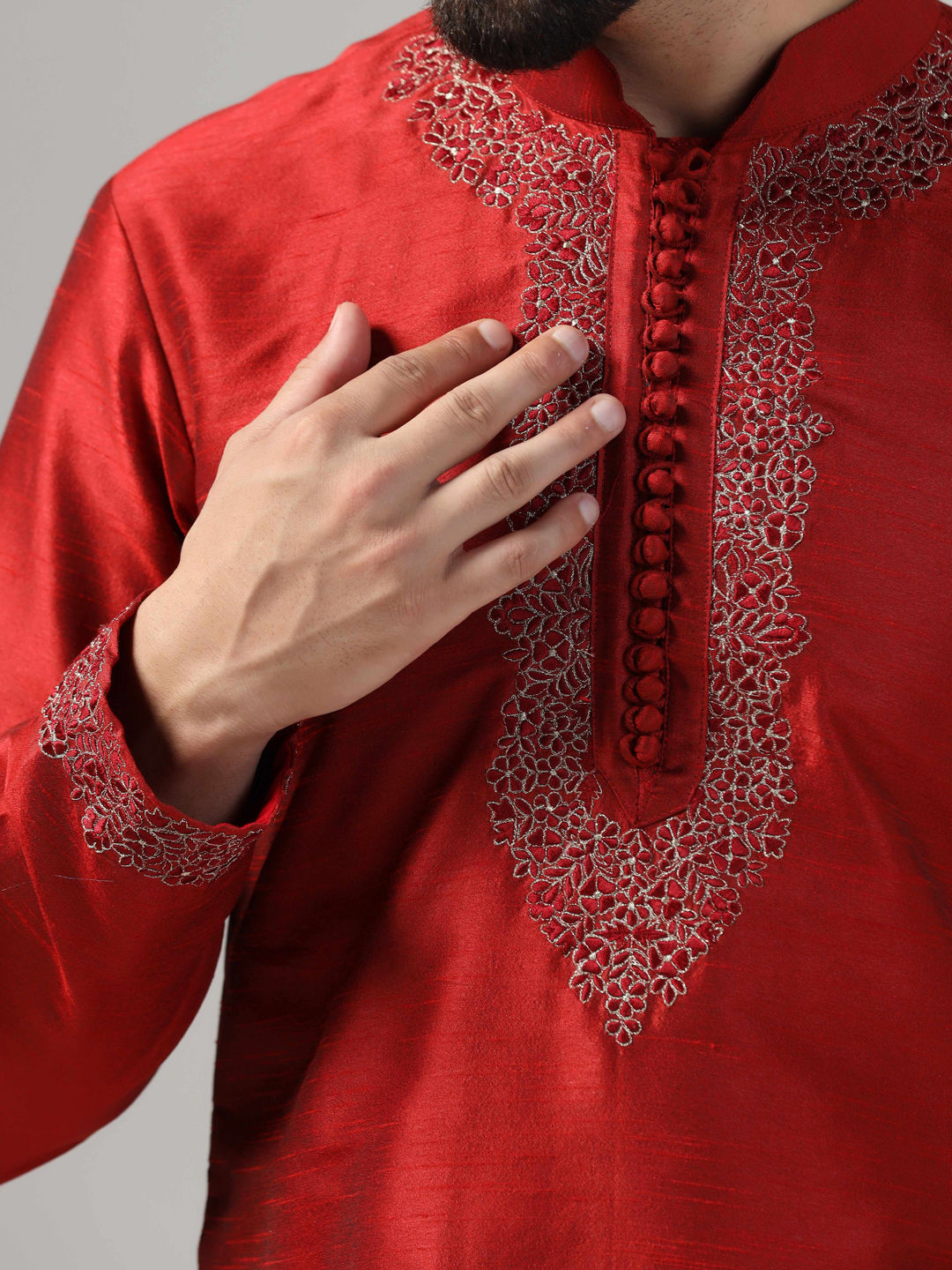 Red and Maroon color Kurta Pyjamas in Raw Silk fabric with Embroidered, Thread work