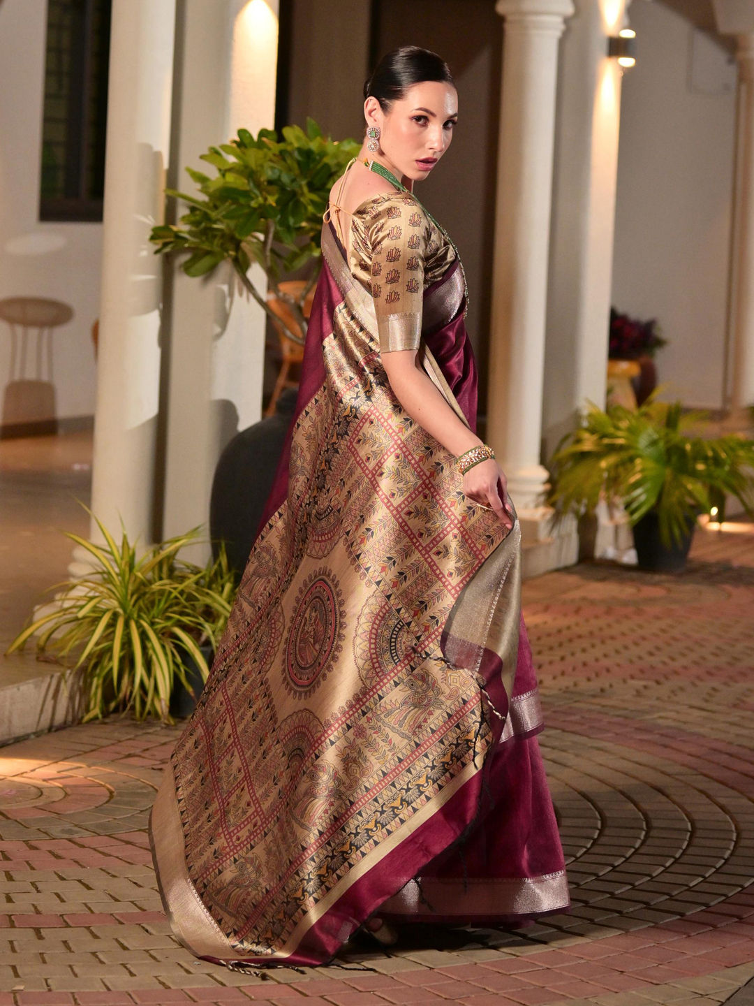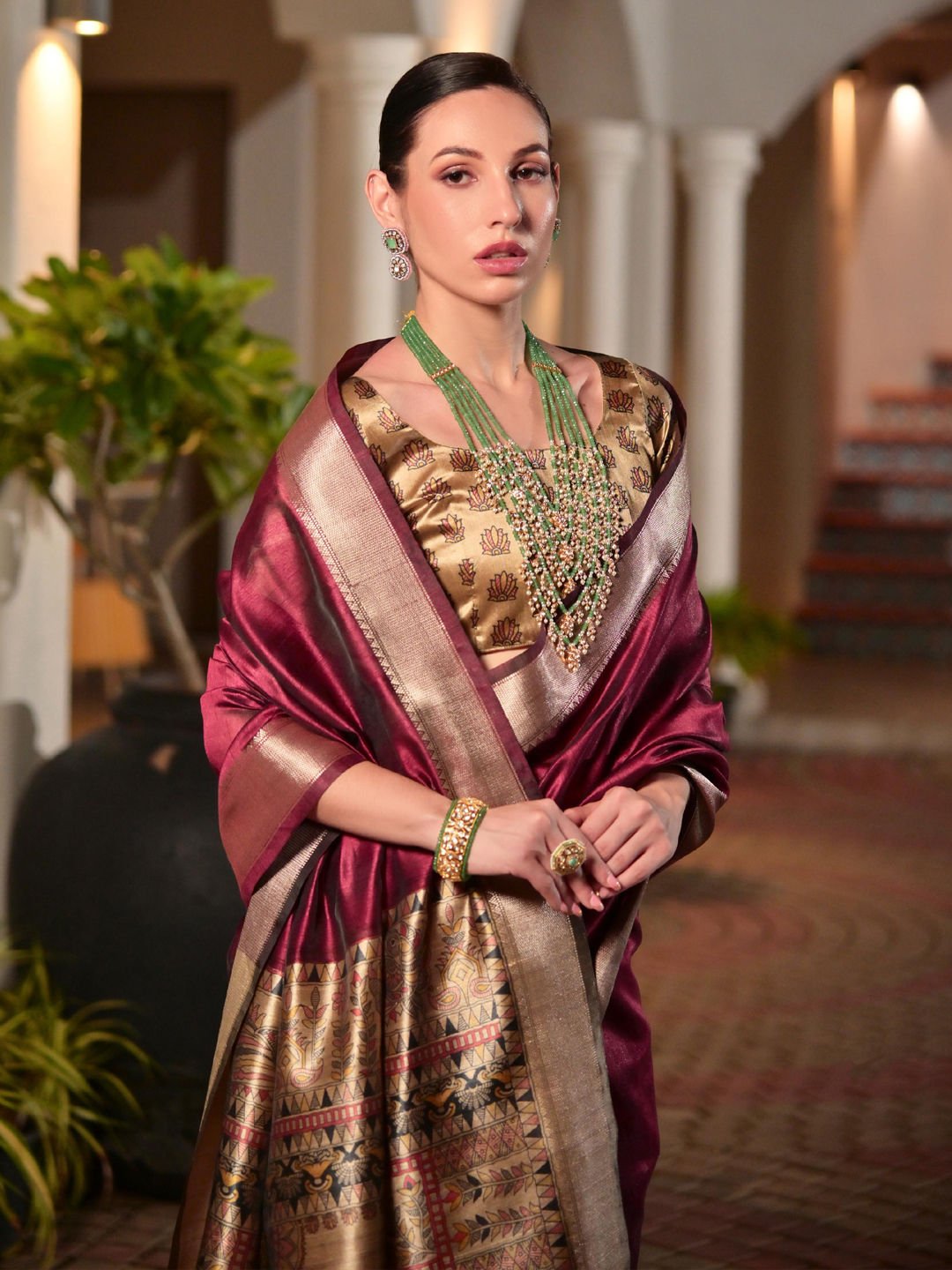 Red and Maroon color Saree in Raw Silk fabric with Weaving work