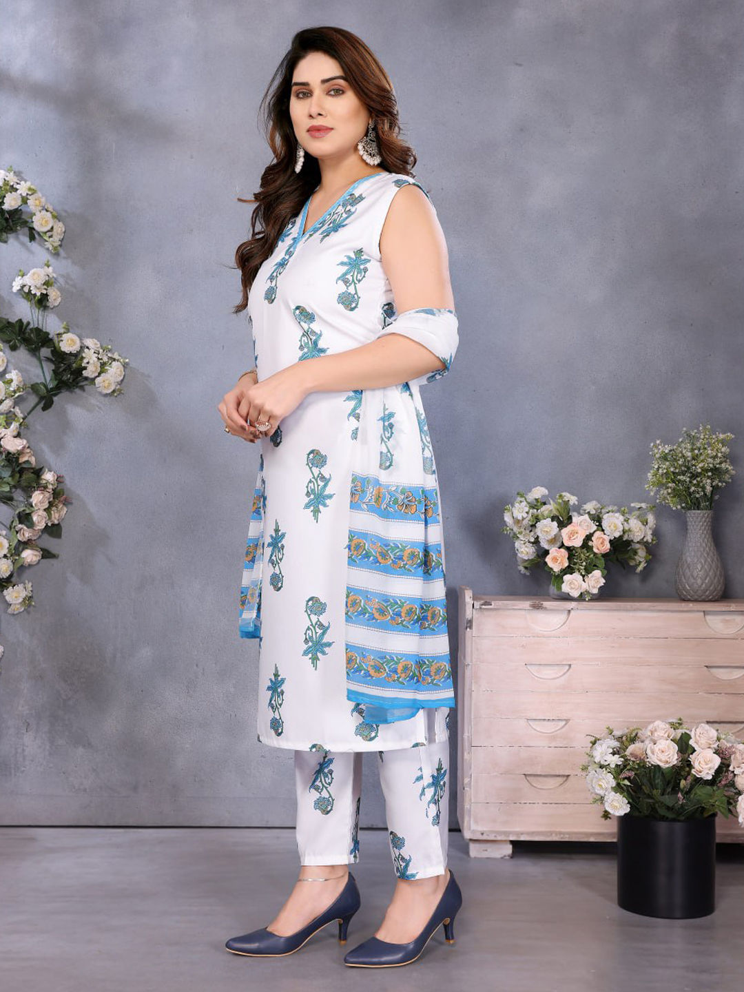 in White and Off White with Floral work