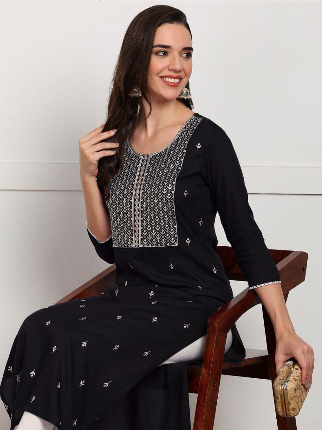 Black and Grey color Kurti in Rayon fabric with Embroidered, Printed work