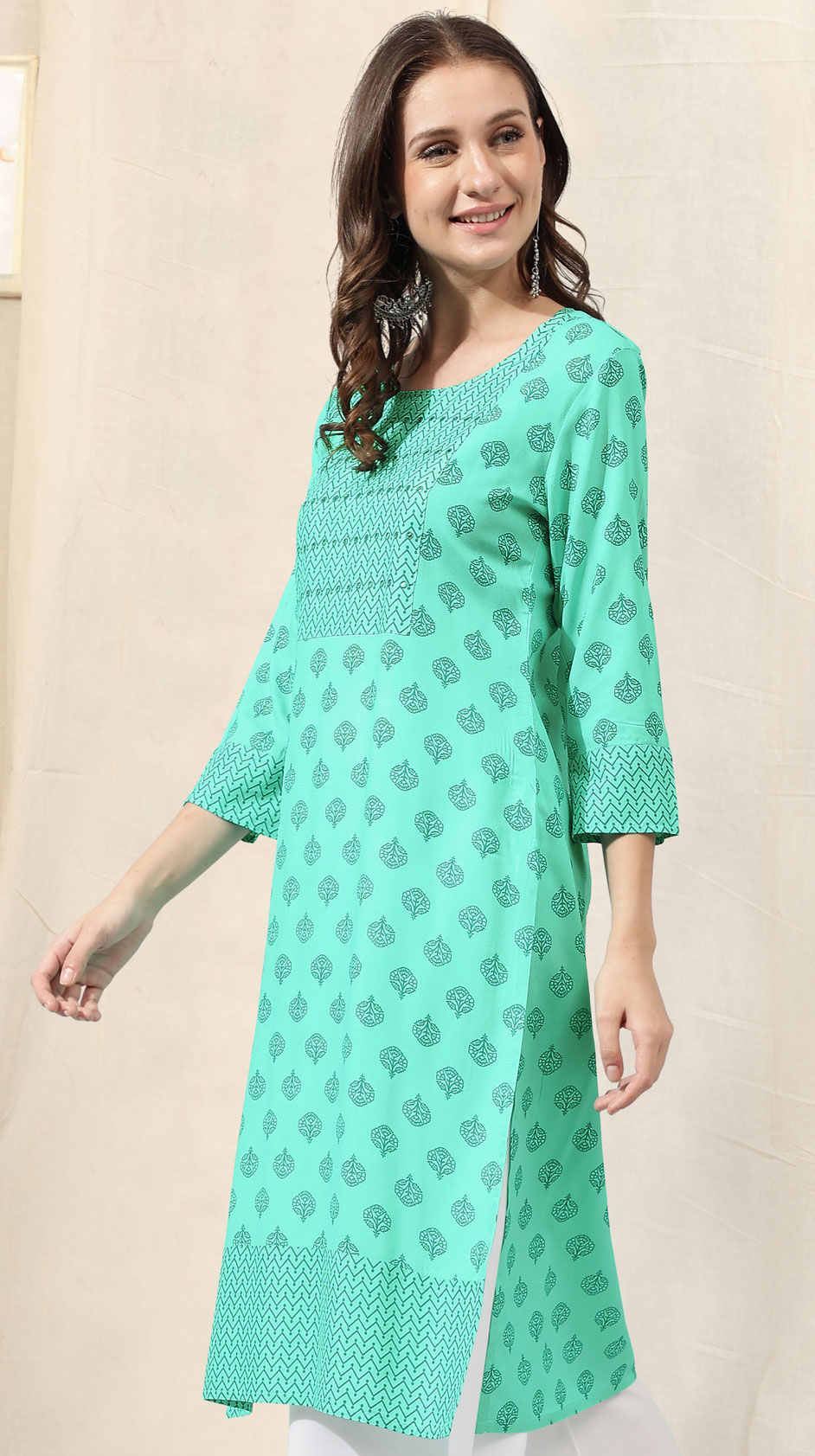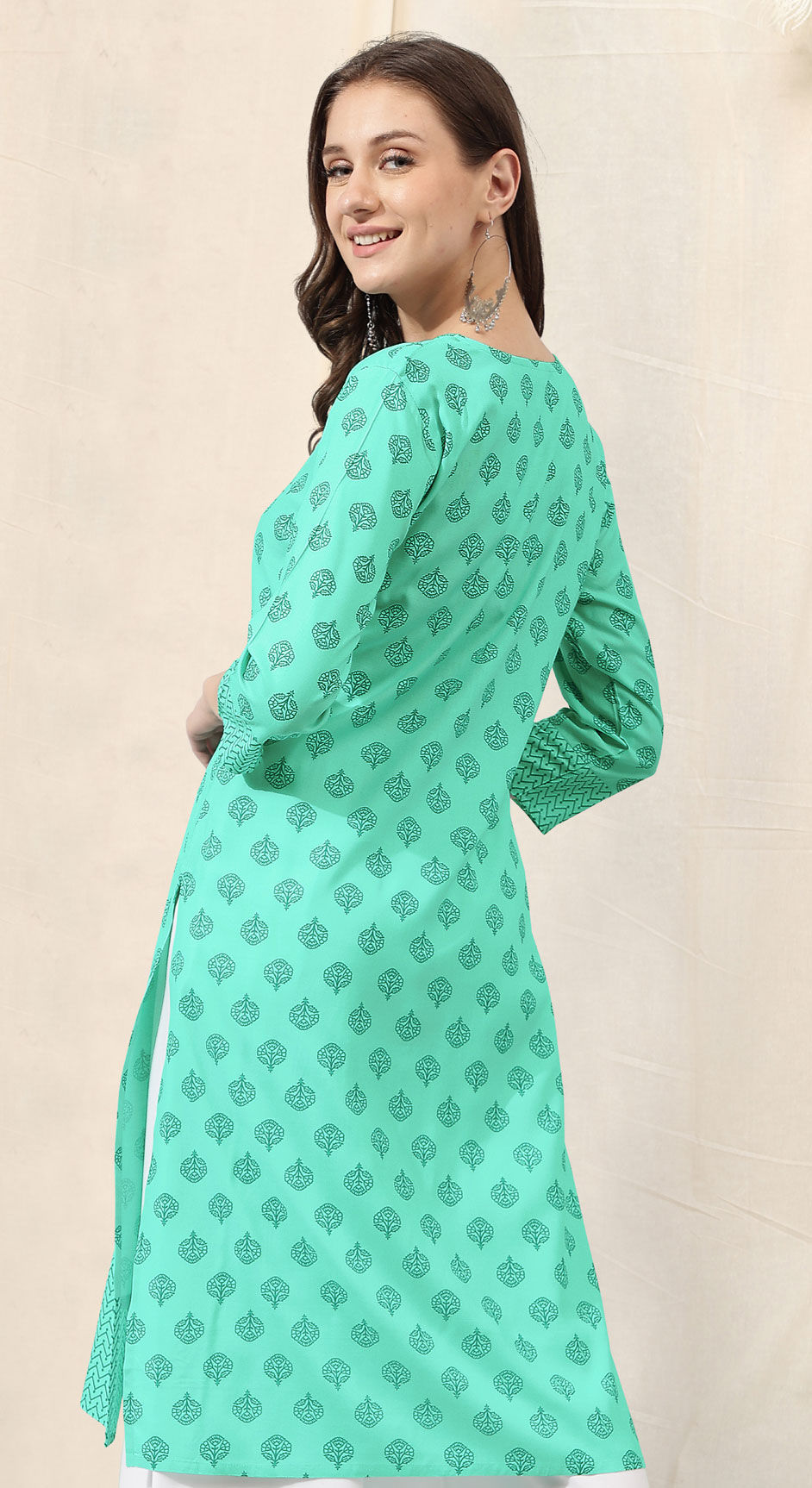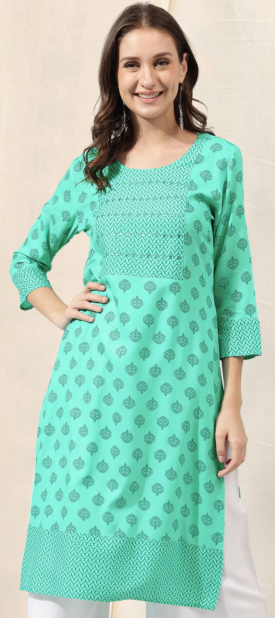Blue color Kurti in Rayon fabric with Embroidered, Patch, Printed work