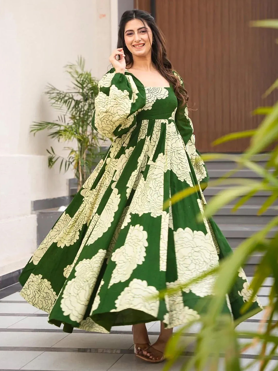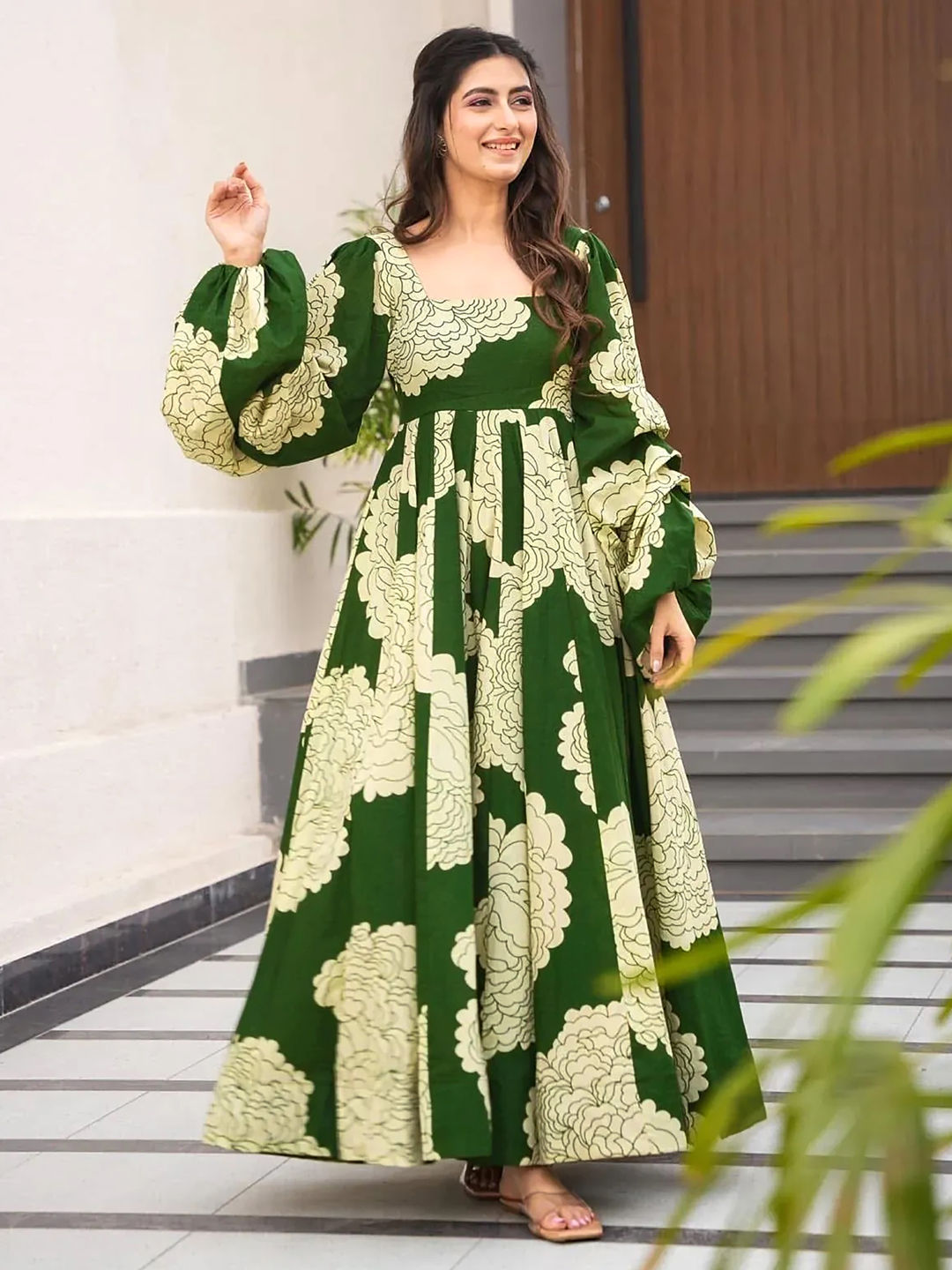 Green color Gown in Rayon fabric with Digital Print work