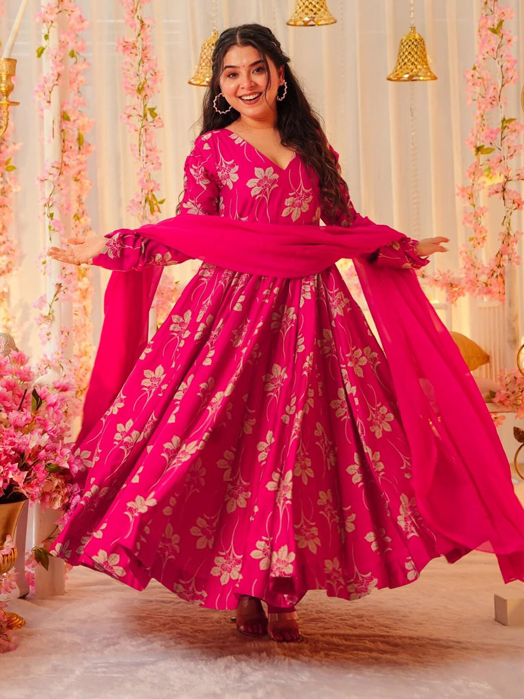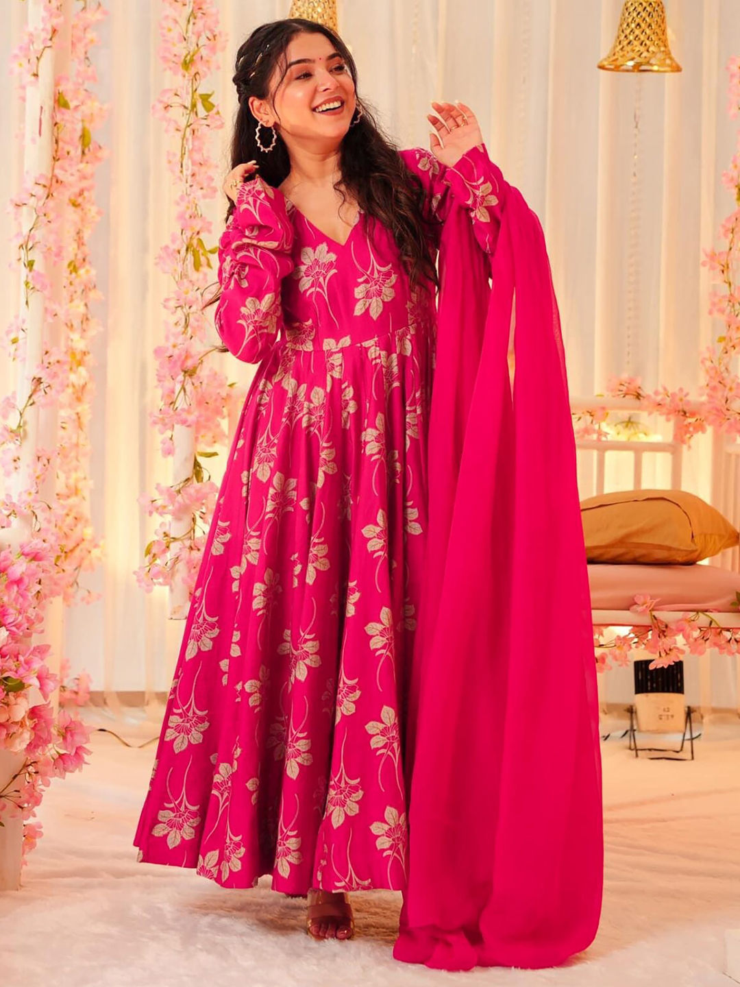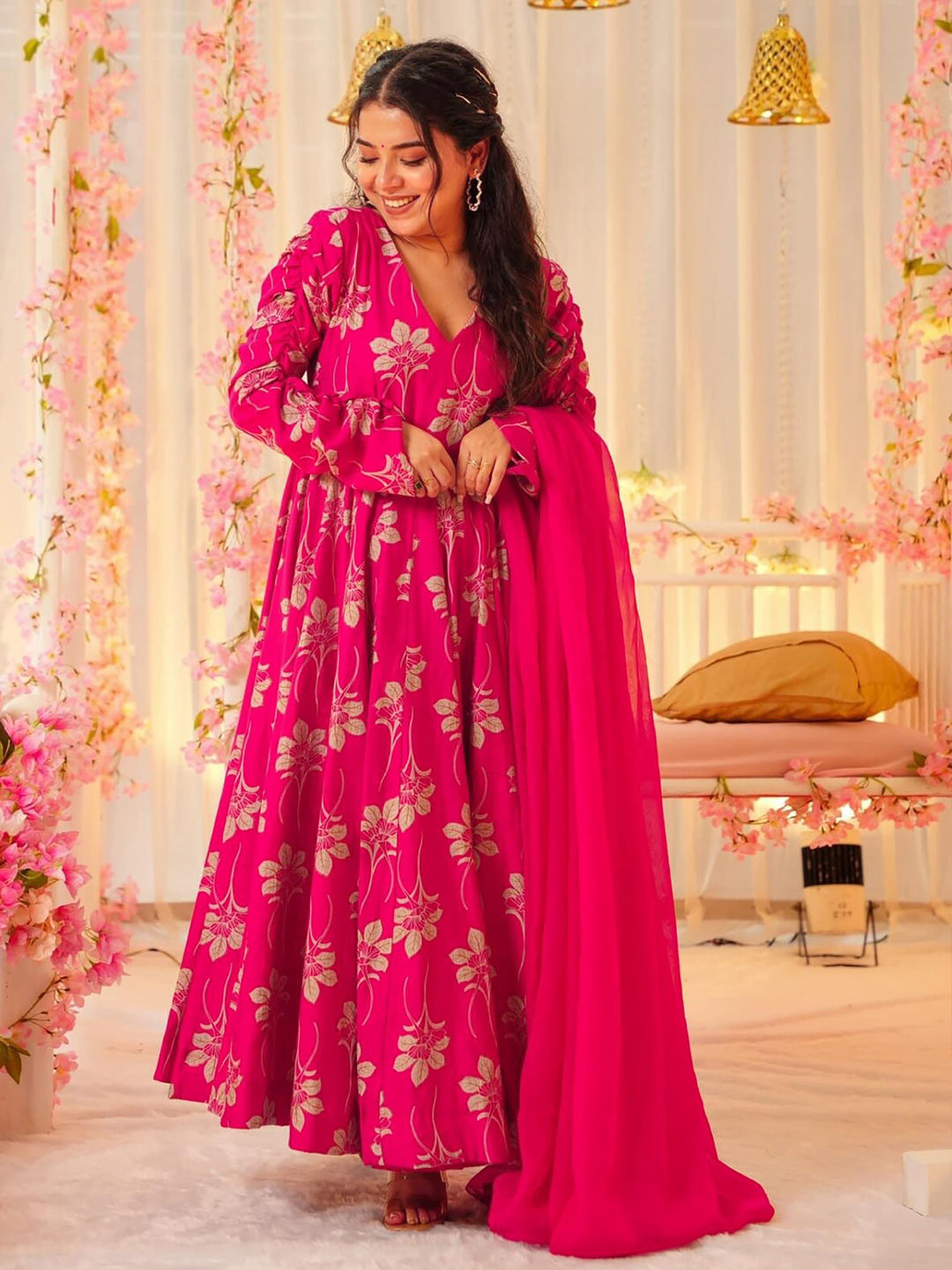 Rayon Festive Gown in Pink and Majenta with Digital Print work