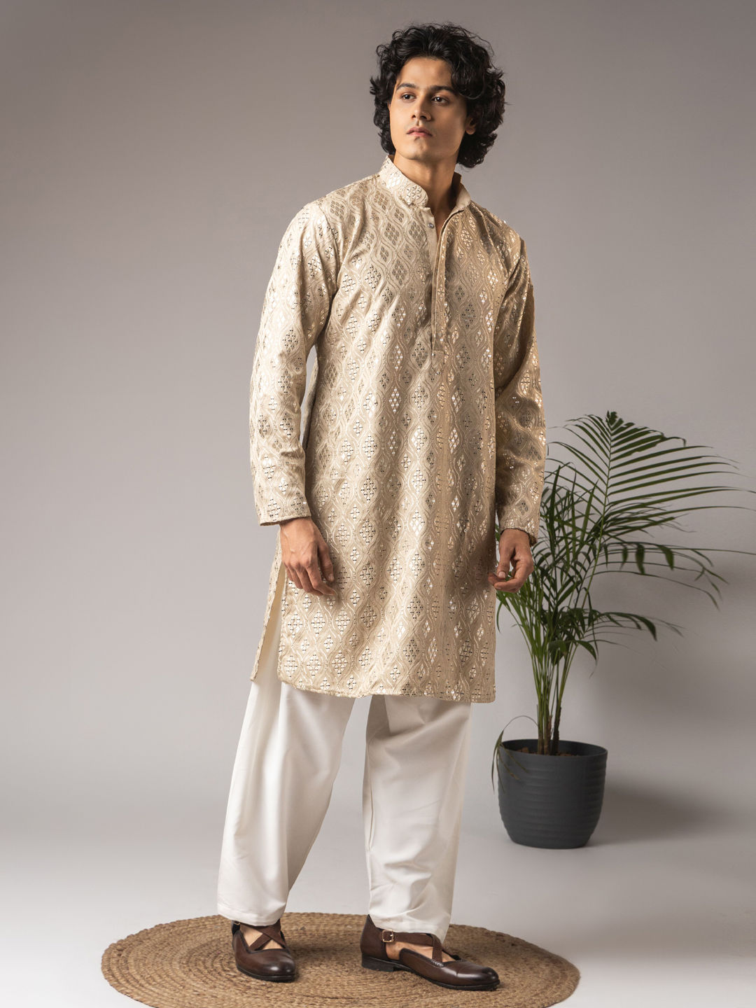 Viscose Wedding Kurta Pyjamas in Beige and Brown with Thread work