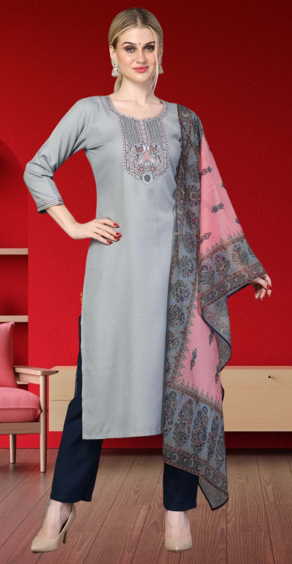 Black and Grey color Salwar Kameez in Rayon fabric with Embroidered, Thread work