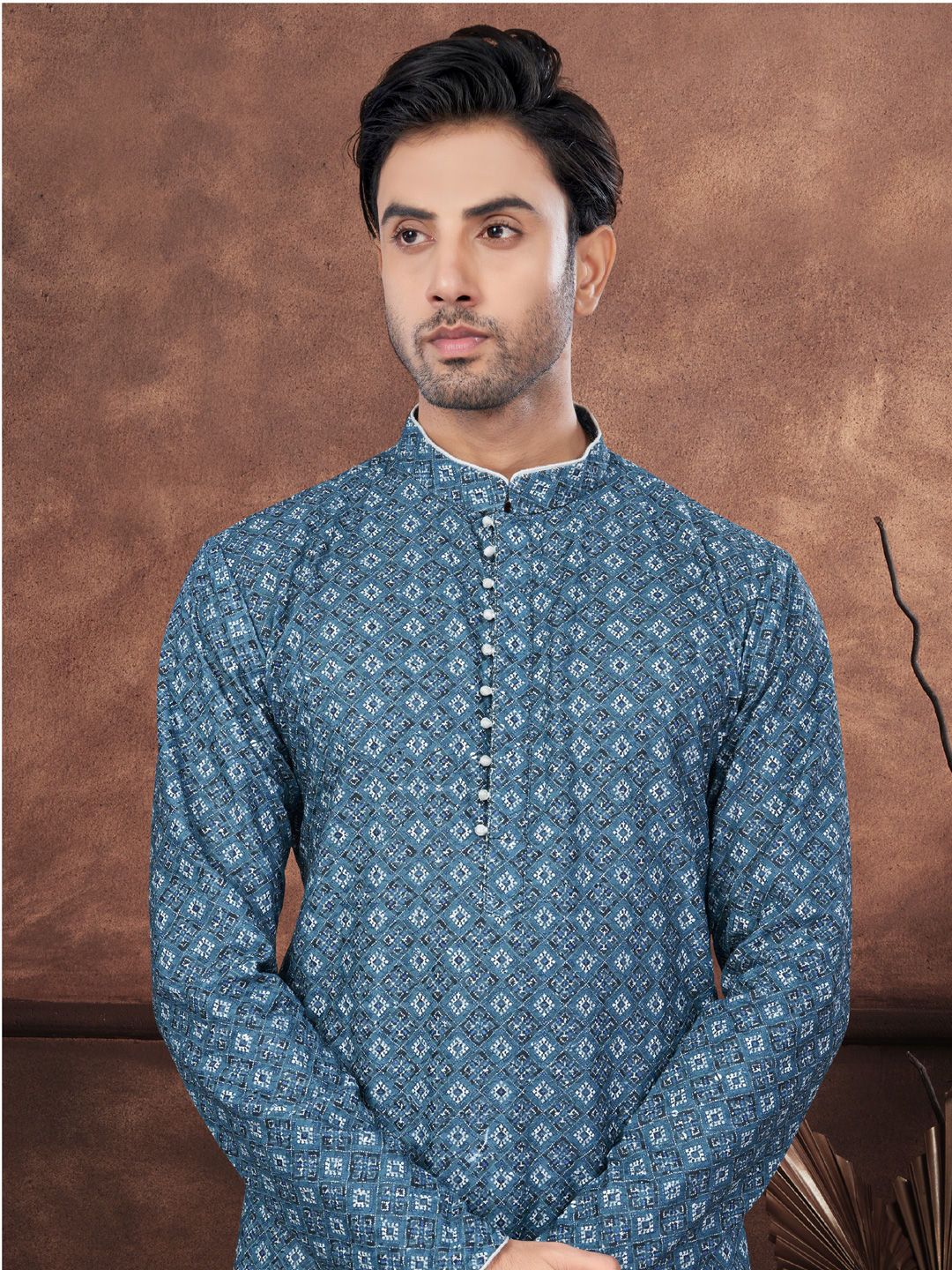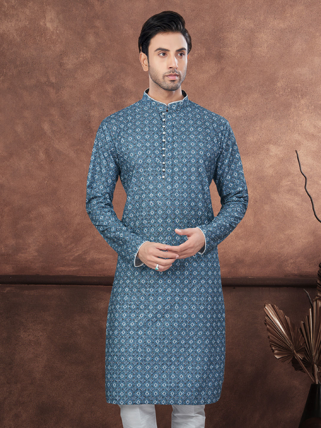 Blue color Kurta in Rayon fabric with Digital Print, Embroidered, Thread work