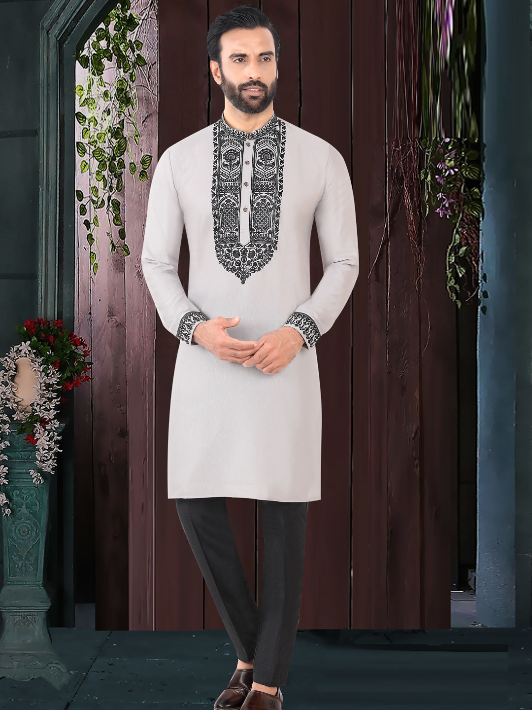 Jacquard Party Wear Kurta Pyjamas in Black and Grey with Embroidered work