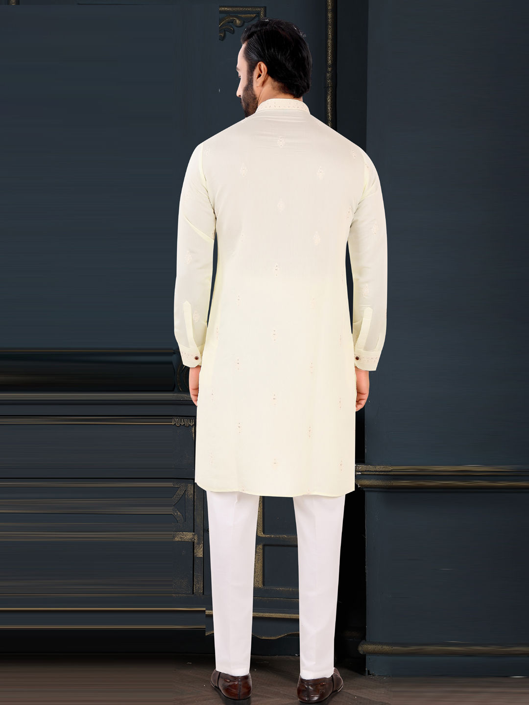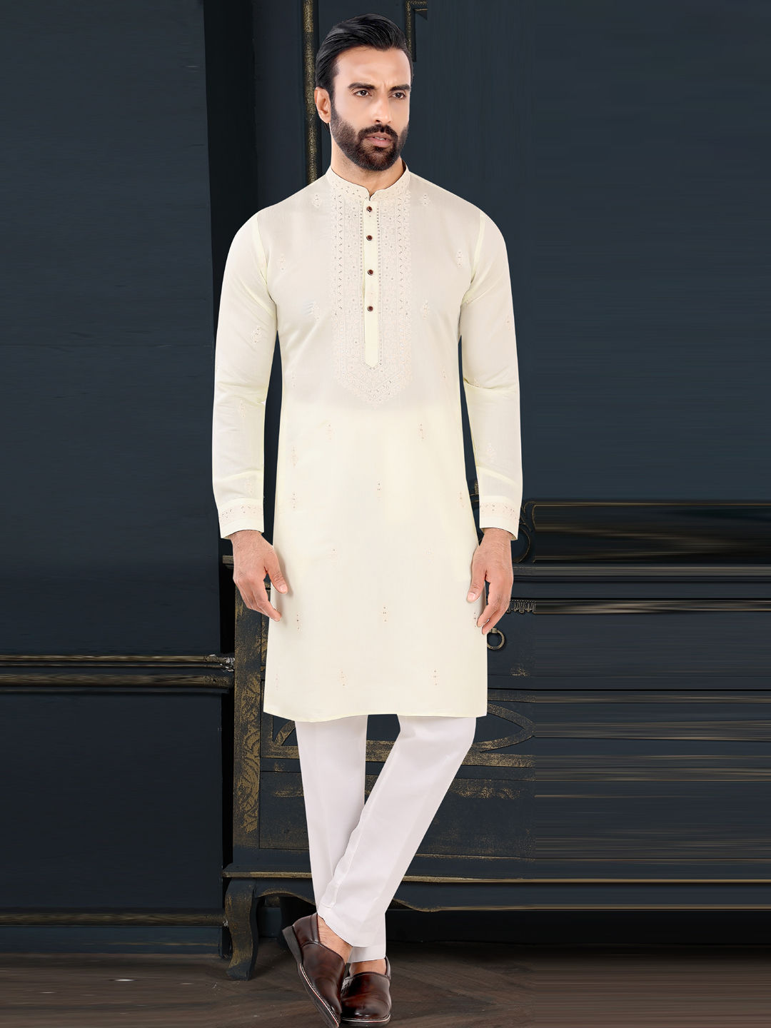 Jacquard Party Wear Kurta Pyjamas in Yellow with Embroidered work