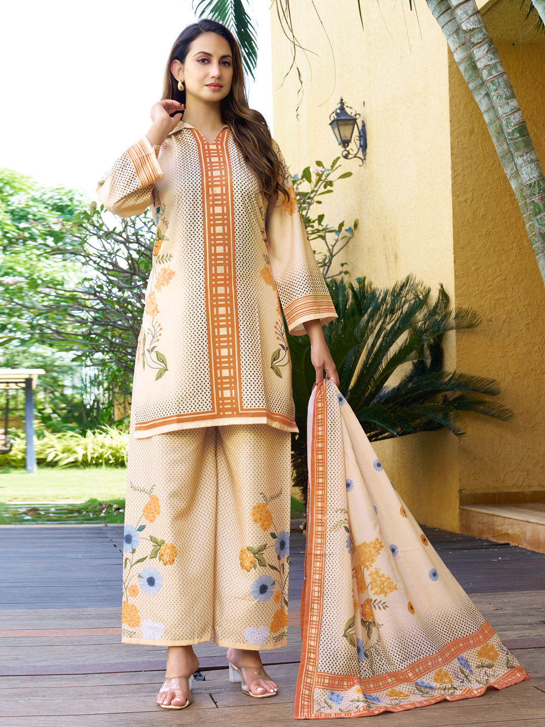 in Beige and Brown with Printed work