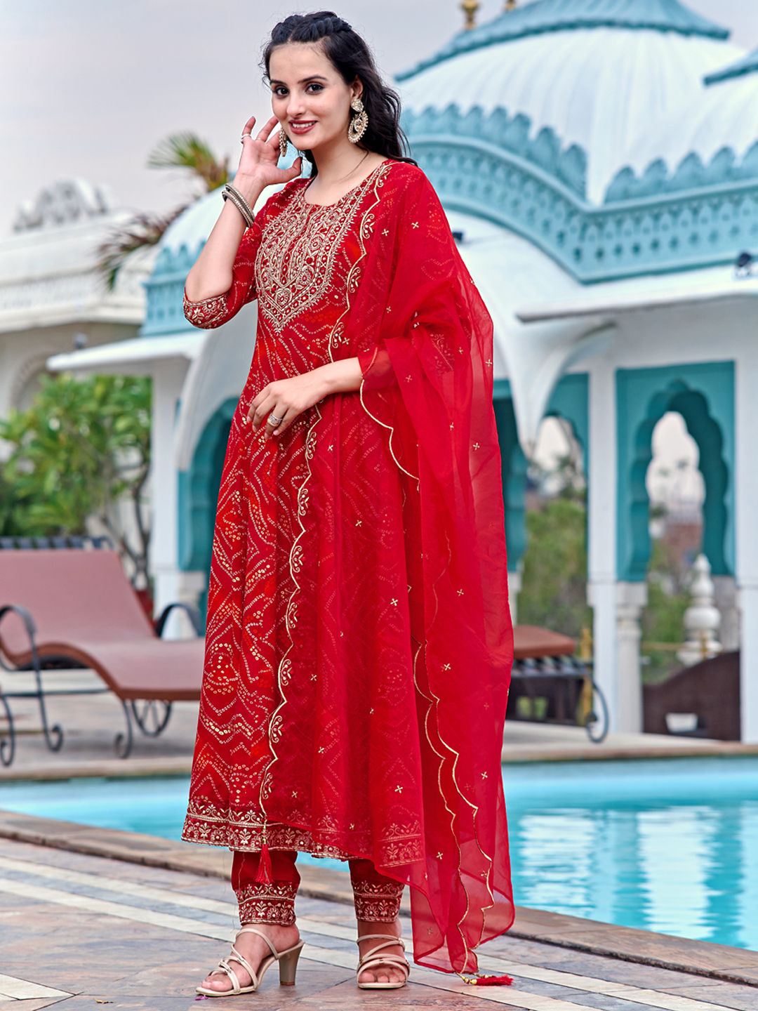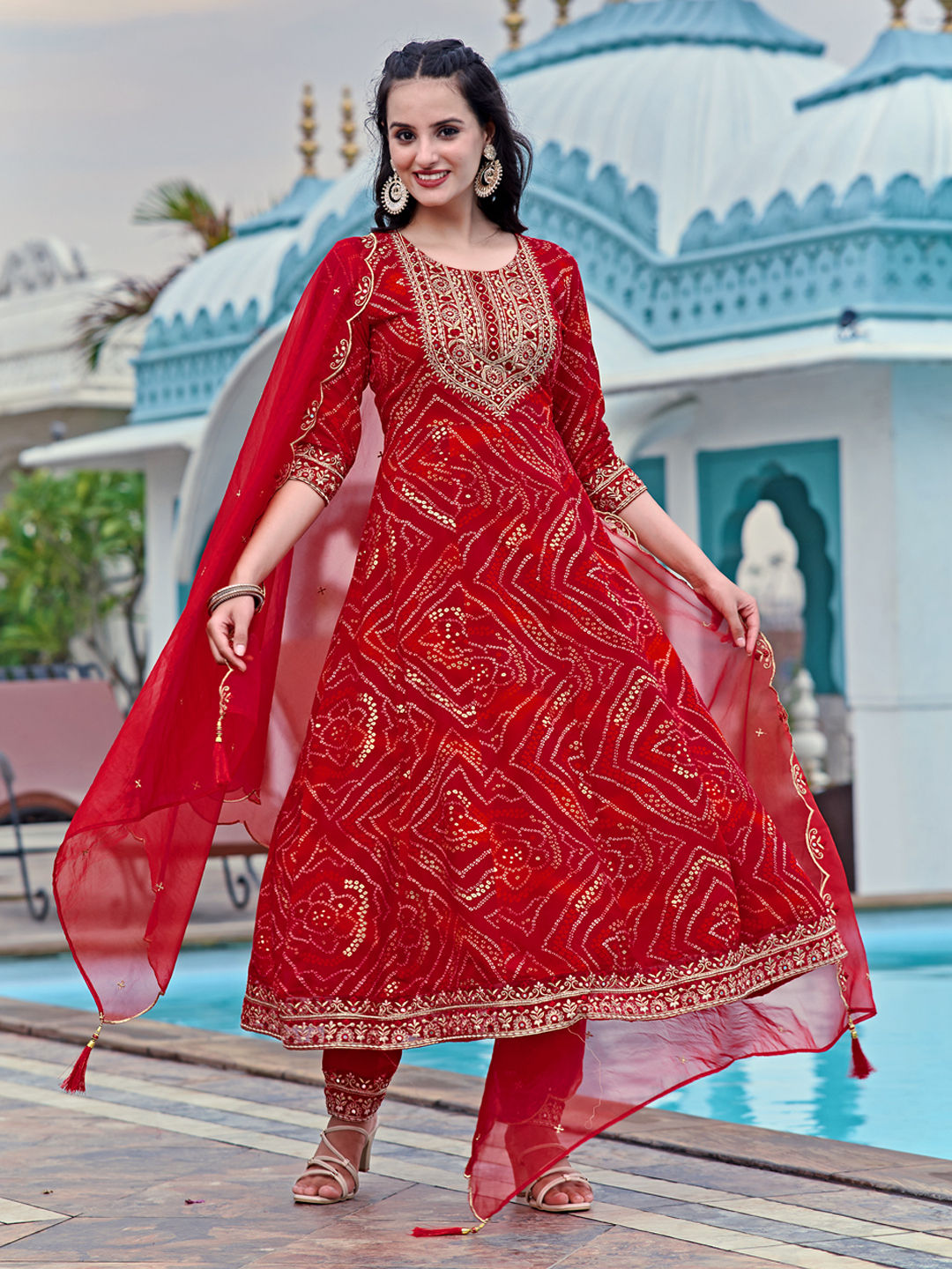 Red and Maroon color Salwar Kameez in Rayon fabric with Bandhej, Embroidered, Printed work