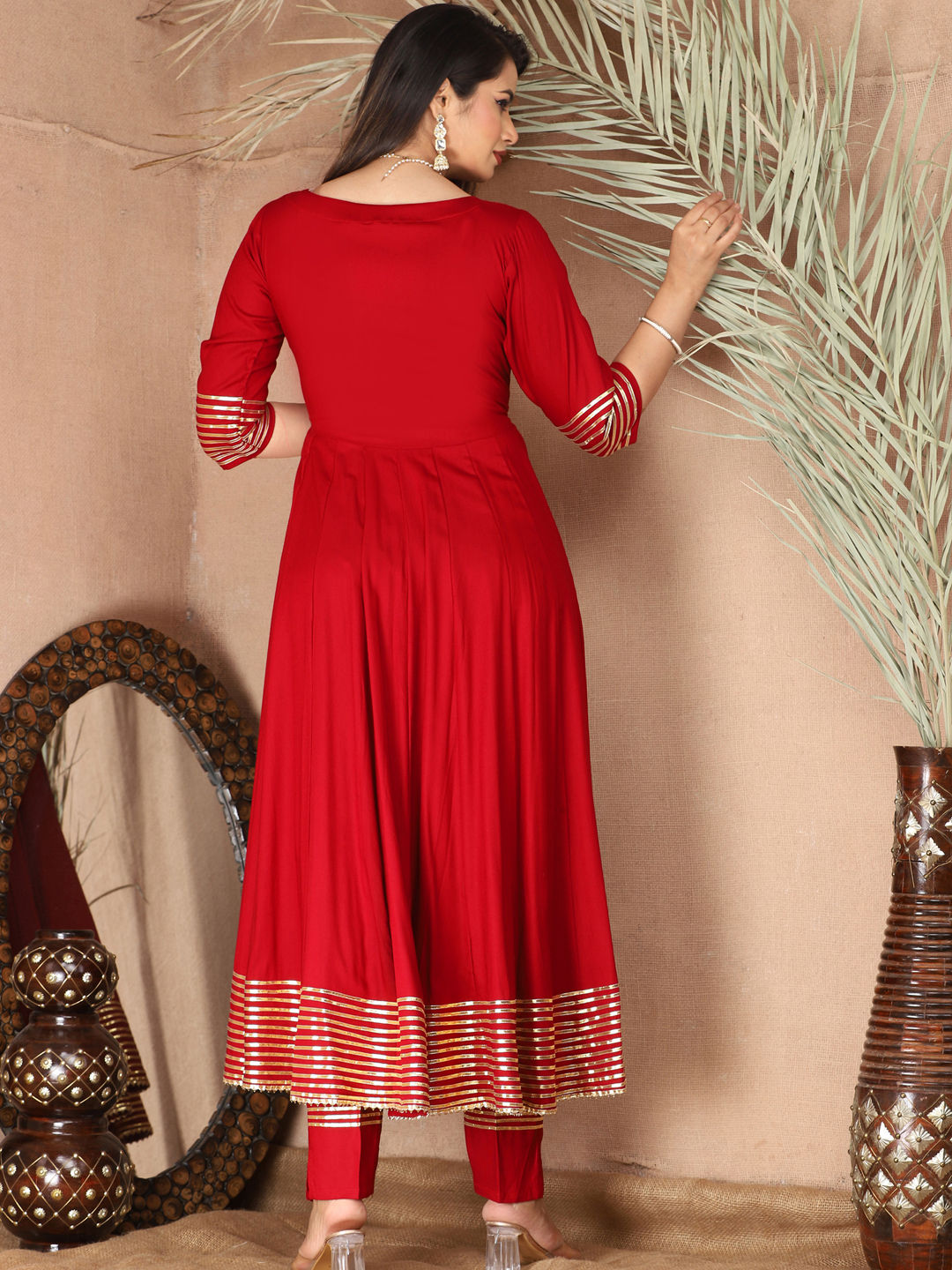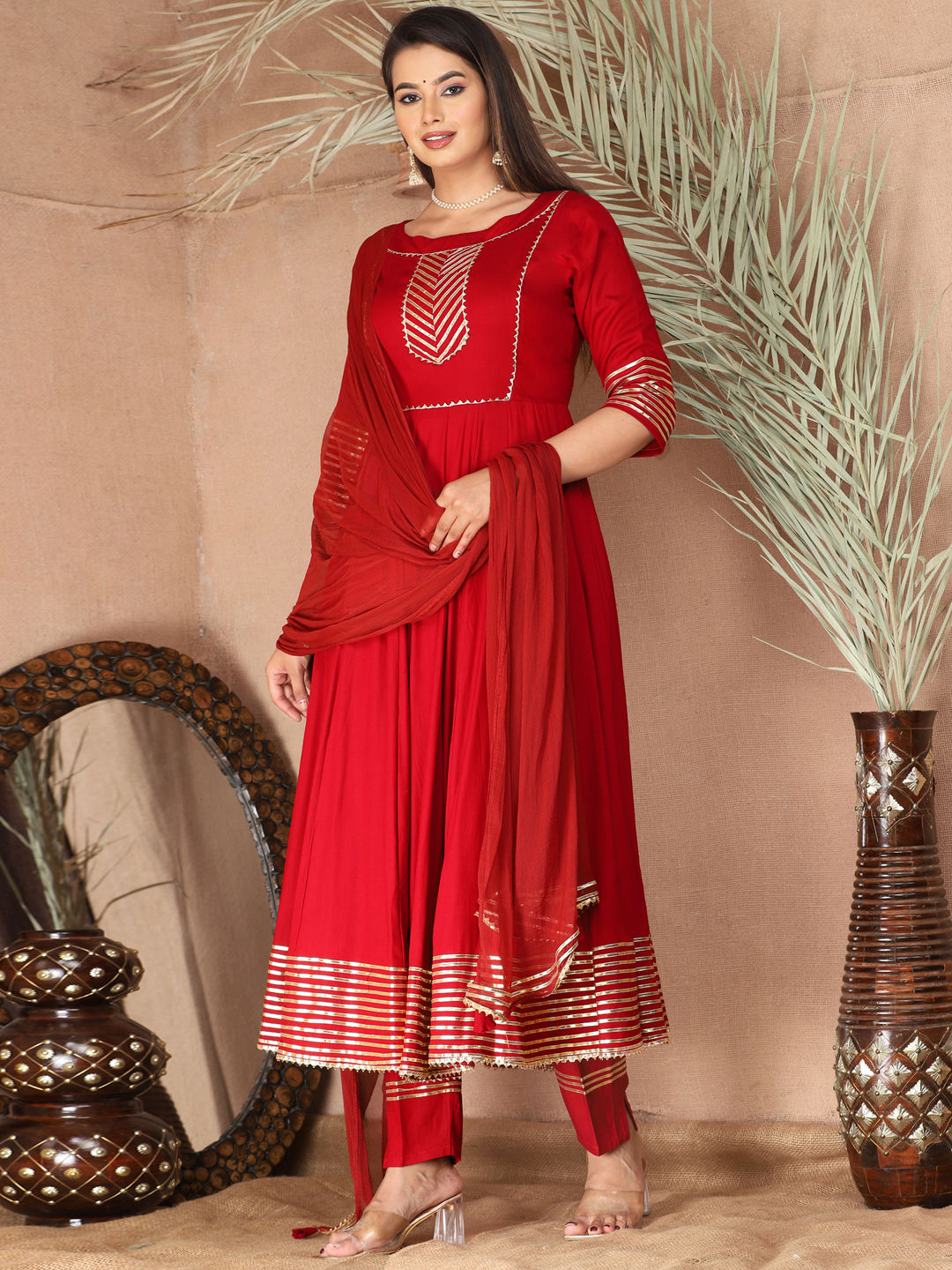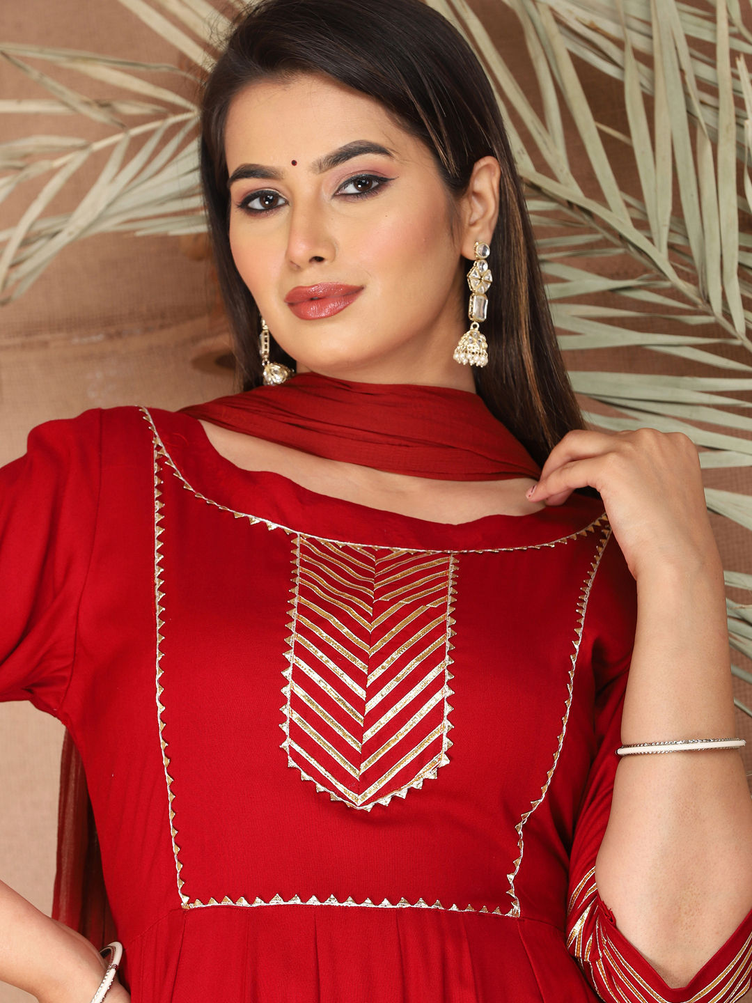Rayon Party Wear Salwar Kameez in Red and Maroon with Gota Patti work
