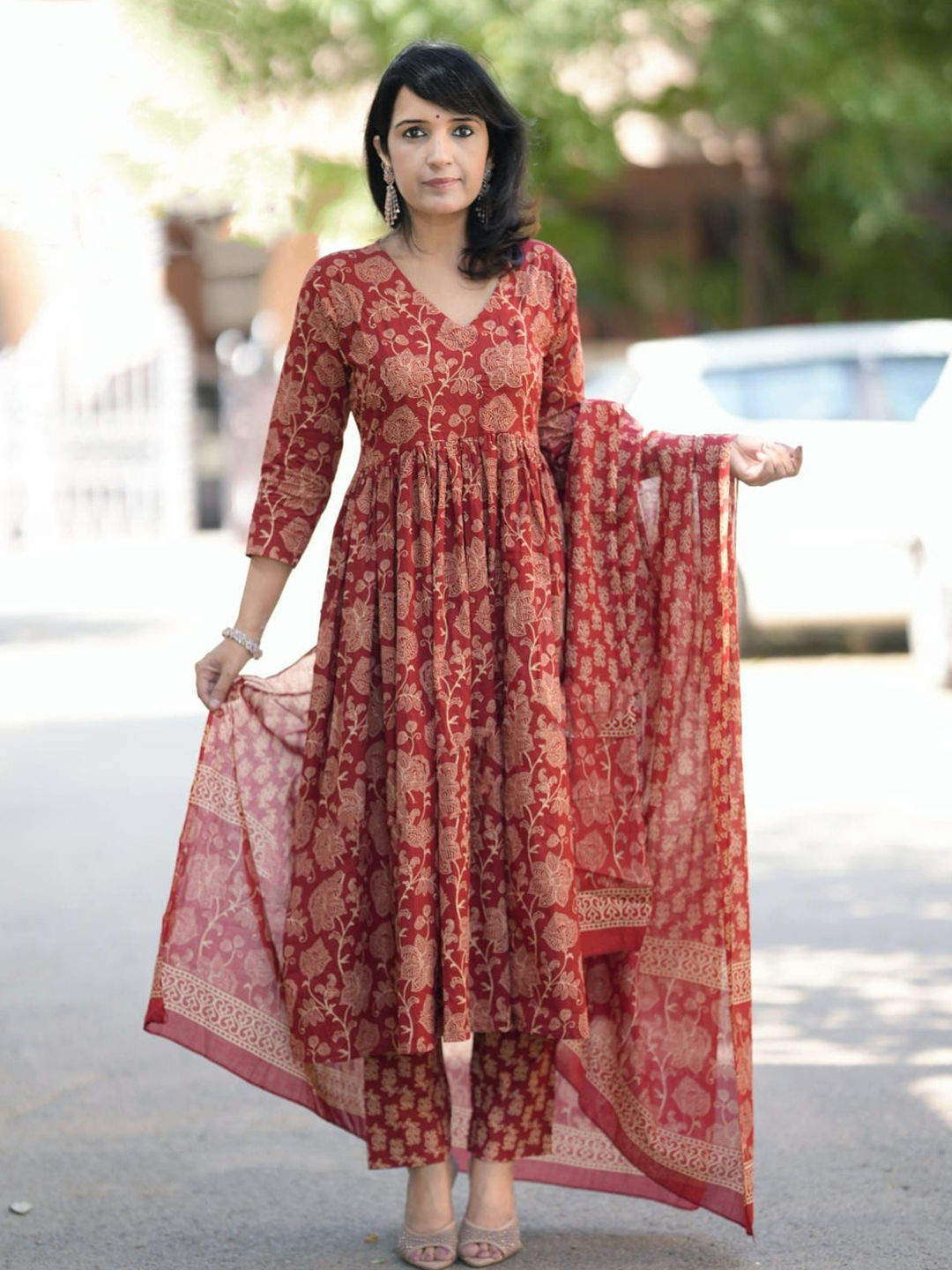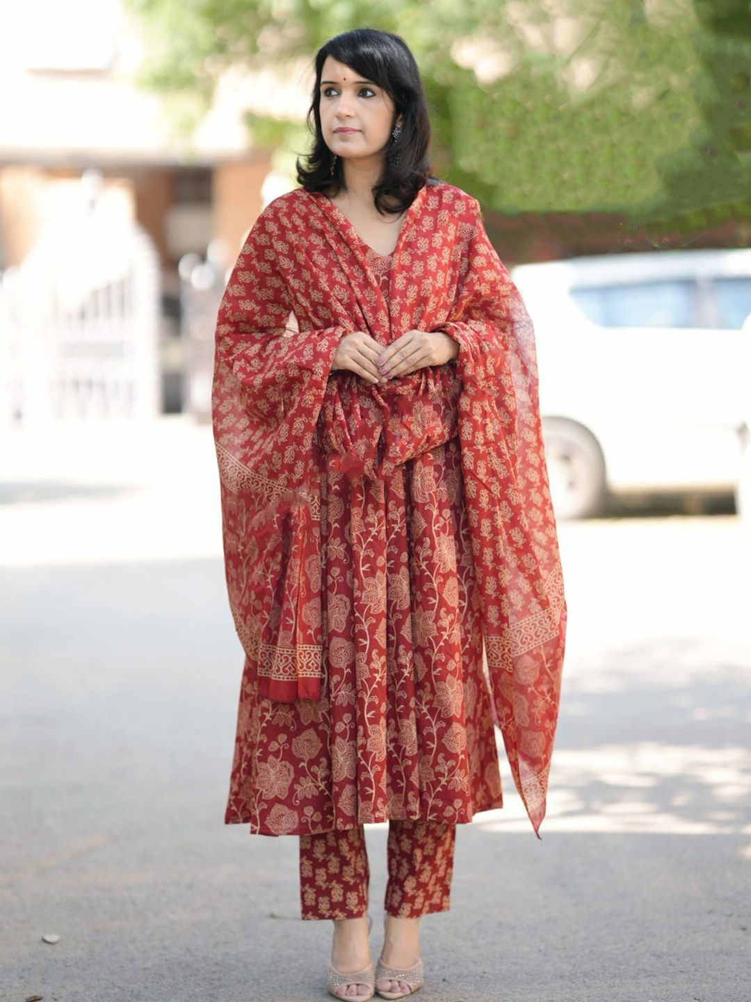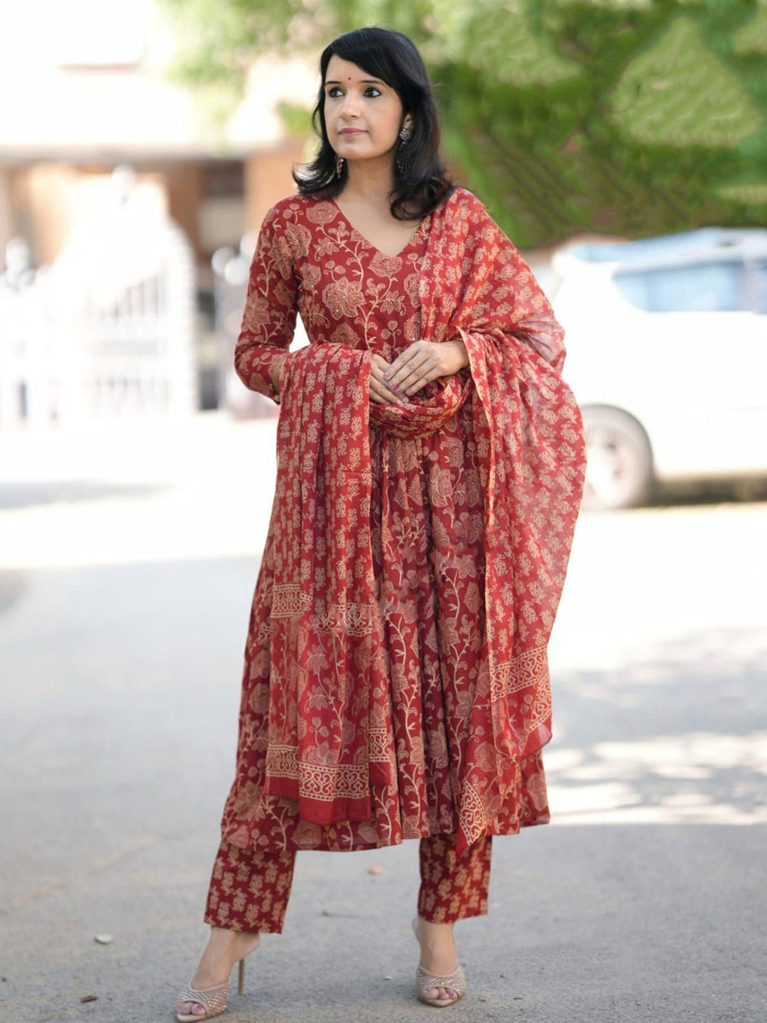 Red and Maroon color Salwar Kameez in Rayon fabric with Printed work